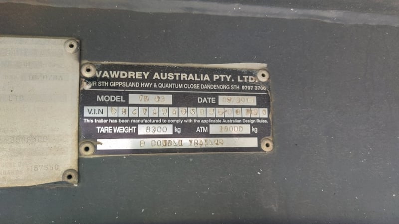 2013 Vawdrey Curtainsider B trailer Year: 2013 Make: Vawdrey Model: VB S3 Body: Curtainsider Configuration: Triaxle Suspension: Airbags VIN: 6HJVAWAUSDSE09320 Description/Extras: 2x undercarriage storage lock boxes, undercarriage storage frame, manual legs ATM: 38000kgs Tare: 8300kgs Dimensions: 1340cm L x 250cm W x Approx 560cm H (from ground to top of headboard)