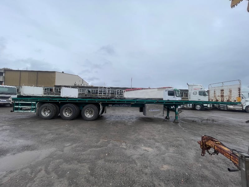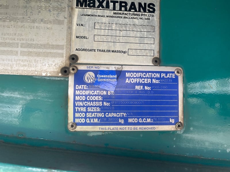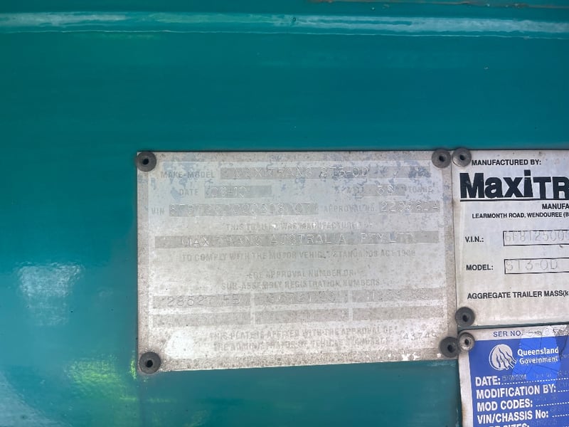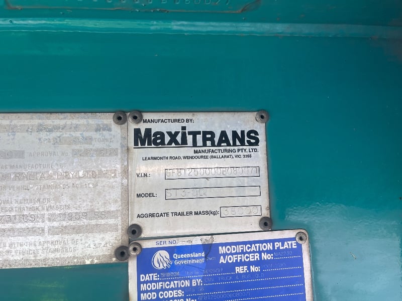 2010 Maxitrans ST3-OD Triaxle Flatdeck B Trailer Year: 2010 Make: Maxitrans Model: ST3-OD Body: Flat Bed Trailer Configuration: Triaxle Suspension: Air Length: Trailer: L 13400mm, OL 13450mm, W 2480mm. Length: 48ft VIN: 6F8T250000B080071 Description/Extras: TARE WEIGHT: ATM: 38000KG 2x undercarriage tool chests