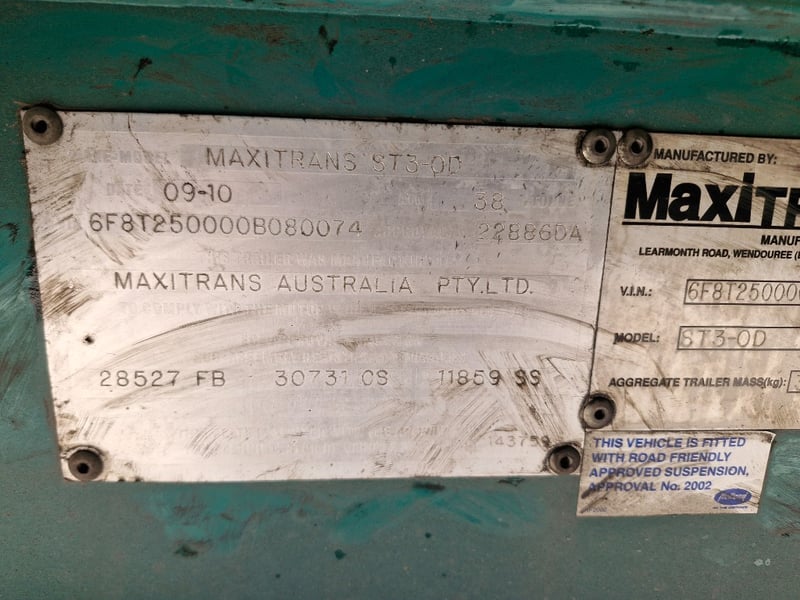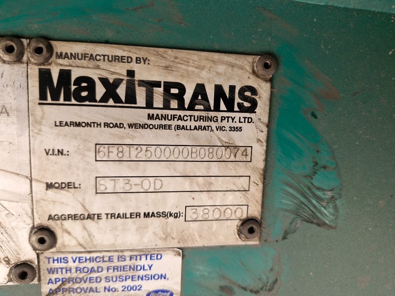 2010 Maxitrans ST3 Triaxle Flatdeck B Trailer Year: 09/2010 Make: Maxitrans Model: ST3-0D Body: Flat Top B Trailer Configuration: Triaxle Suspension: Airbag Length: 14760mm. 48ft VIN: 6F8T250000B080074 ATM: 38,000kg Description/Extras: Front Headboard, Storage Box, Axle counter Indicating 748948kms