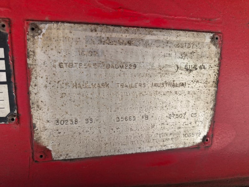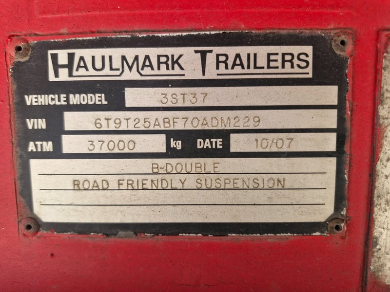 2007 Haulmark Semi Flat top A Trailer Year: 10/2007 Make: Haulmark Model: 3ST37 Body: Flat Top Configuration: Tri Axle Suspension: Airbag Length: 10.4m or 33ft VIN: 6T9T25ABF70ADM229 Description/Extras: Front Headboard Axle Scales. Jost turntable TARE WEIGHT: ATM: 37000kg