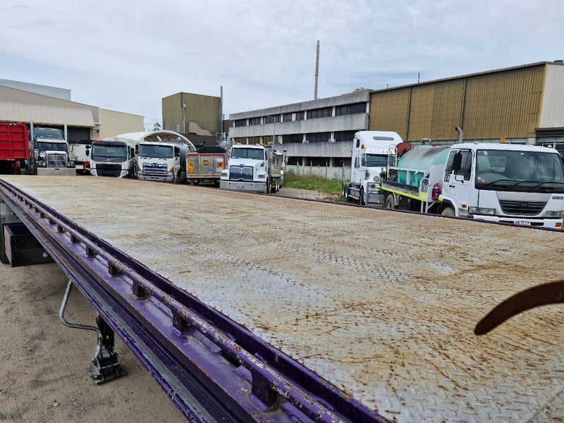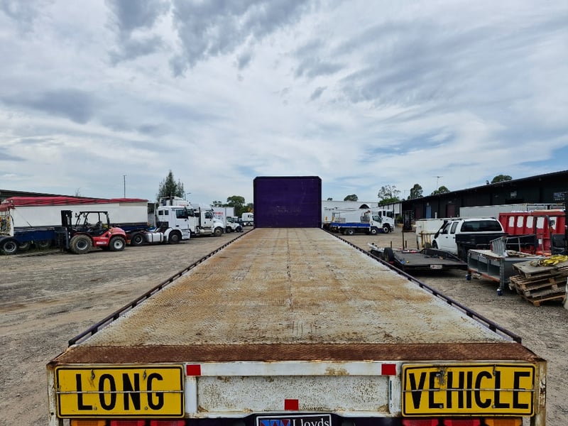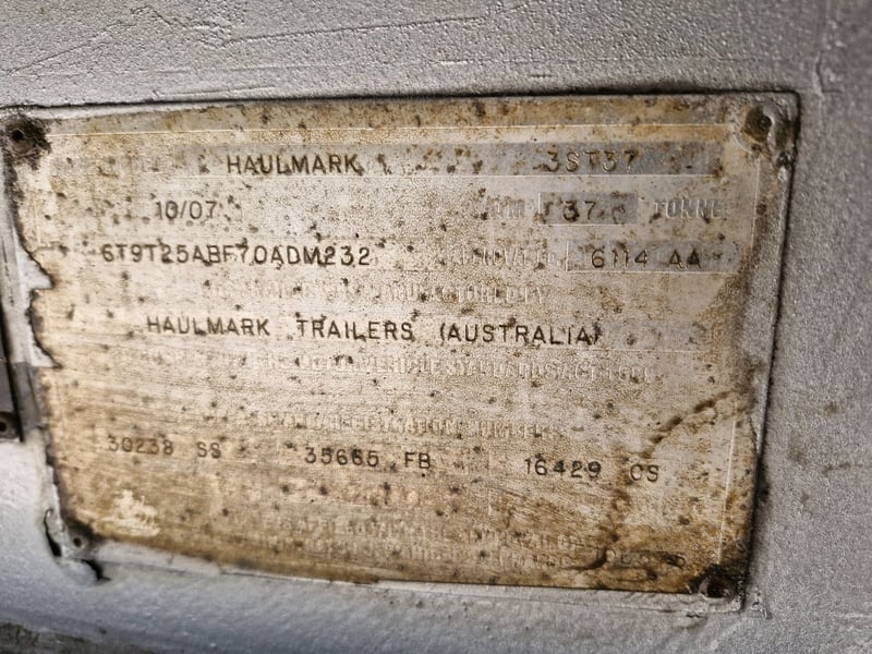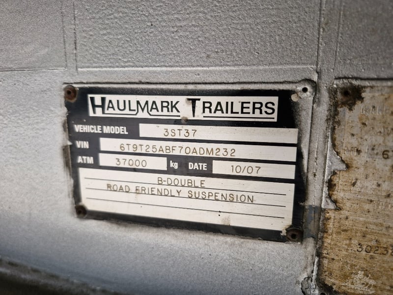2007 Haulmark Flat top Semi B trailer Year: 10/2007 Make: HaulmarkModel: 3ST37Body: Flat Top B TrailerConfiguration: Tri AxleSuspension: AirbagLength: 13.4m or 43ftVIN: 6T9T25ABF70ADM232Description/Extras: Front Headboad, Dunnage BoxTARE WEIGHT: 14341kgATM: 37000kg
