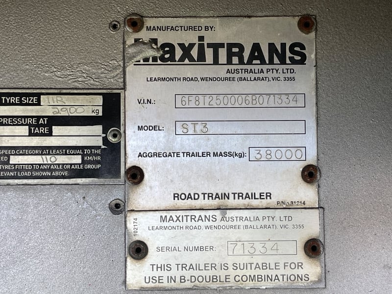 2006 Maxitrans ST3 Flatbed B trailer Year: 2006 Make: Maxitrans Model: ST3 Body: Flatbed Configuration: Triaxle Suspension: Airbags VIN: 6F8T250006B071334 Description/Extras: 3x undercarriage storage lock boxes, undercarriage storage cage, manual legs, VDO kienzle ATM: 38000kgs Dimensions: 1340cm L x 250cm W x 280cm H (from ground to headboard). Length: 44ft