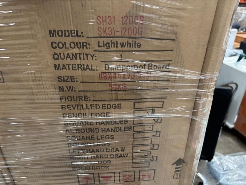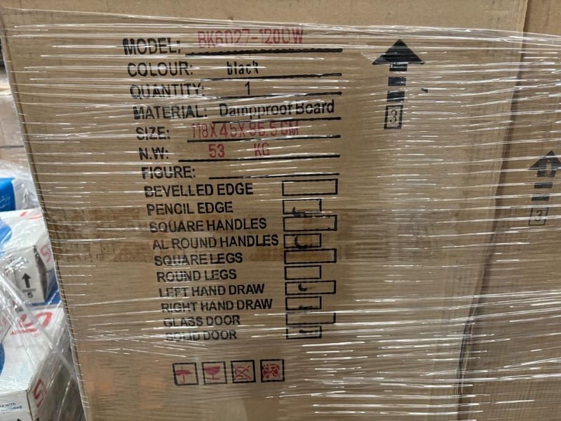 BK6027-1200W, Black Dampproof Cabinets, Qty: 3, Dimensions: 45x118x86cmSH/SK31-1200G, White Dampproof Cabinets, Qty: 1, Dimensions: 45x118x74cmSold as pallet lot