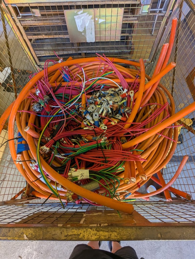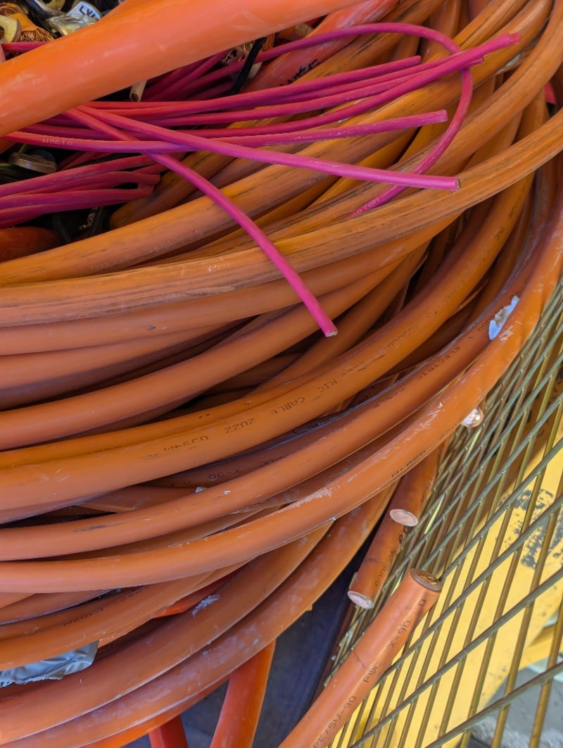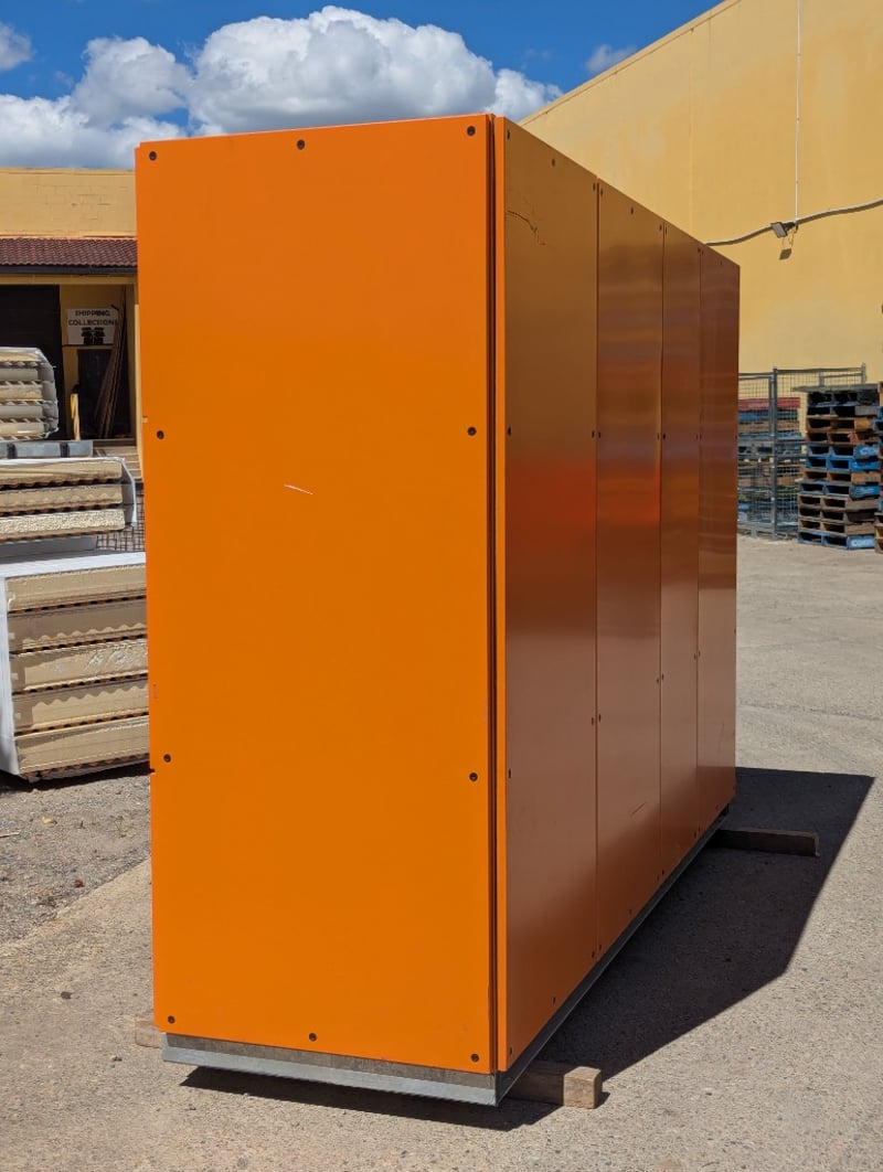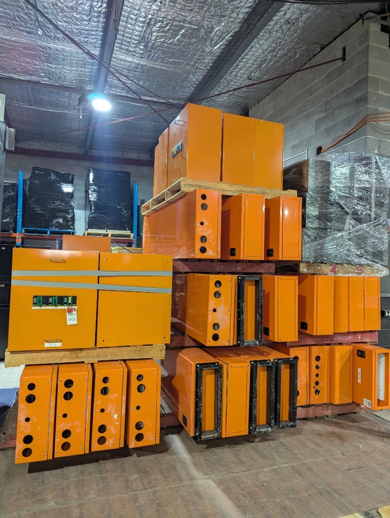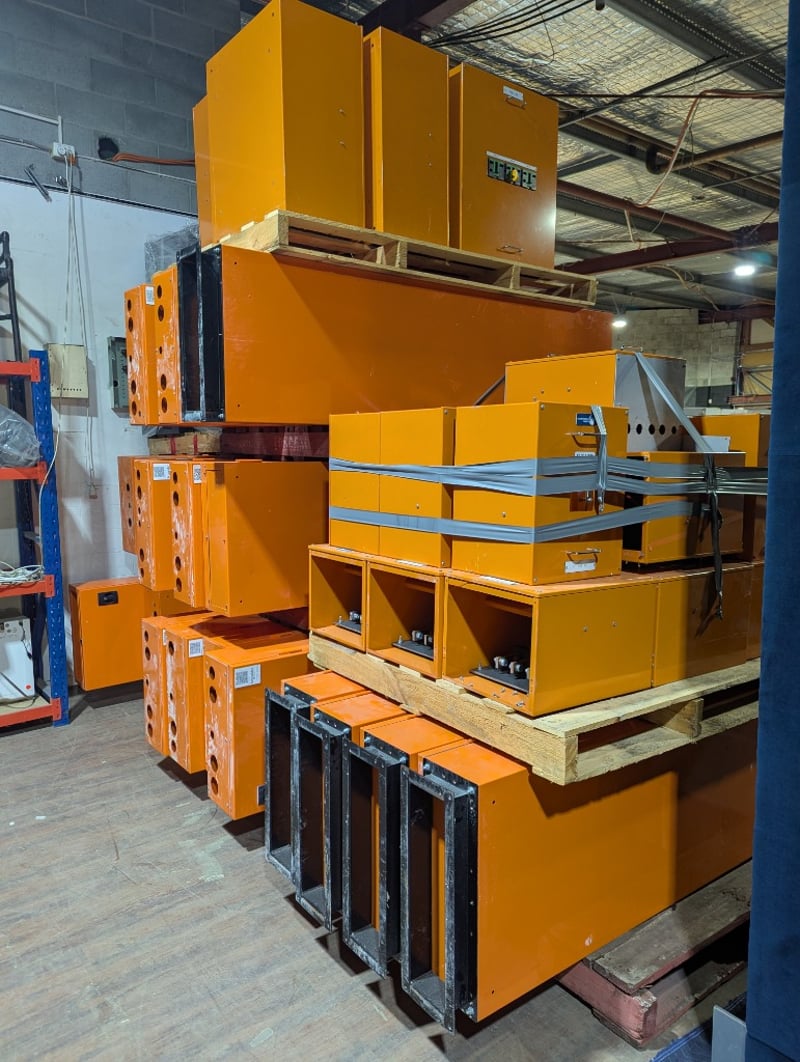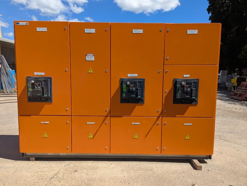 Switchboards, Electrical Cupboards & Copper Wire. Bulk lot comprising multiple industrial electrical enclosures and distribution units. Including orange powder-coated steel cabinets featuring Schneider Electric components, specifically transformer units (TX15, TX16 configurations), bus bar assemblies with mechanical switching mechanisms, and circuit protection equipment. Lot contains approximately 20+ modular enclosure units in varying sizes, complemented by extensive copper cabling shorts approx 1250kg, spent brass terminal lugs, and mechanical fastening components. Sold as lot Contact: Mark David - 0437 318 344