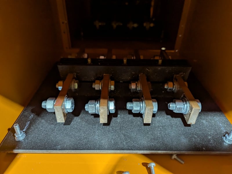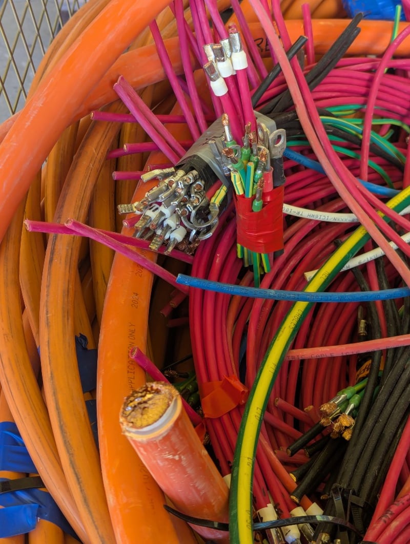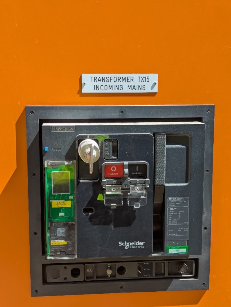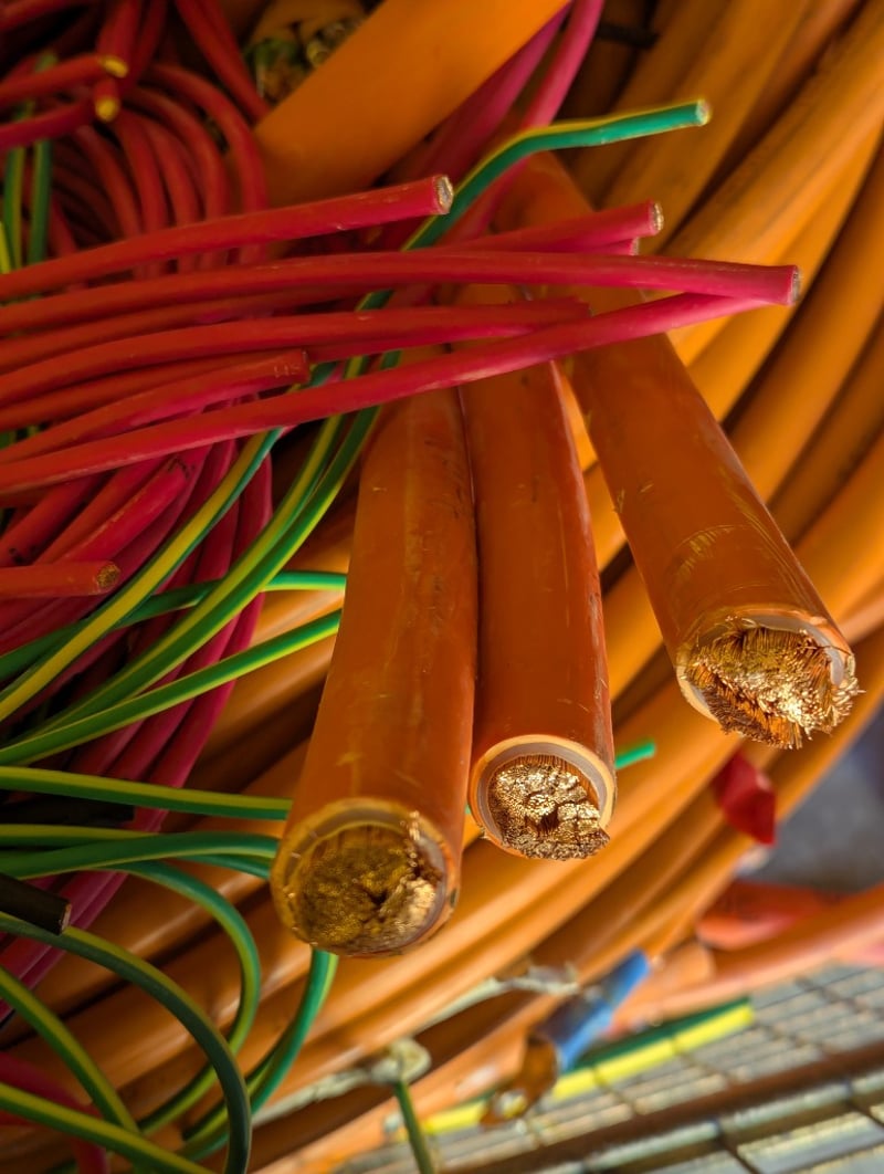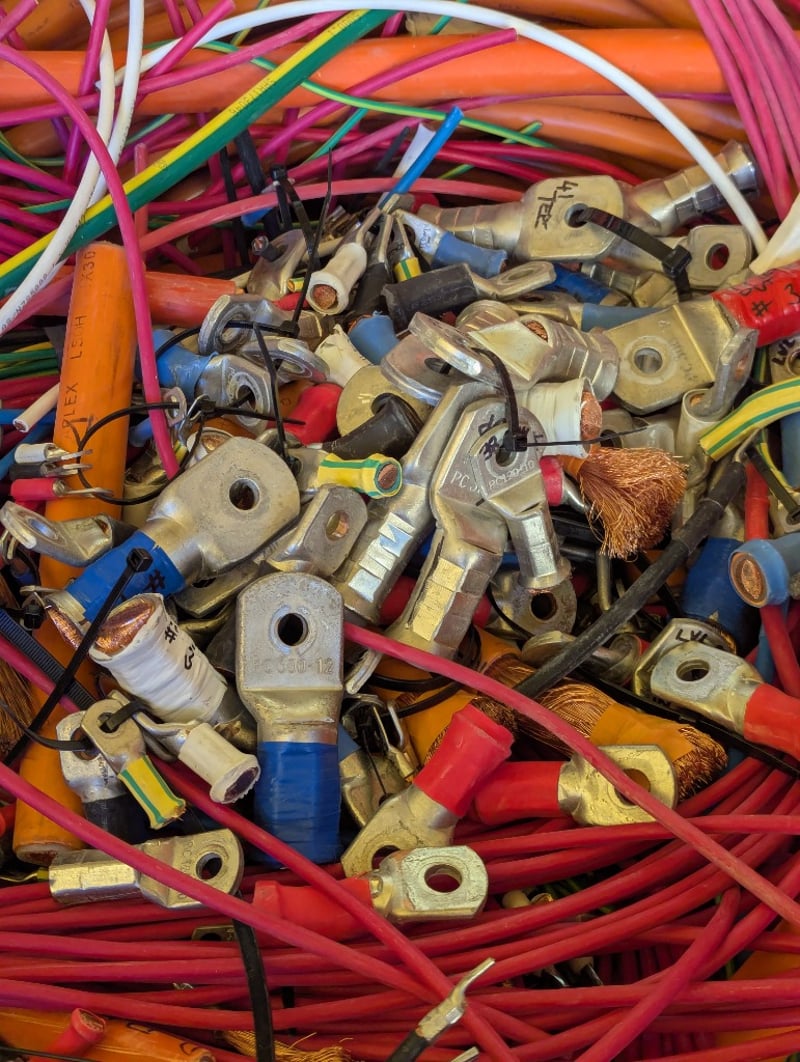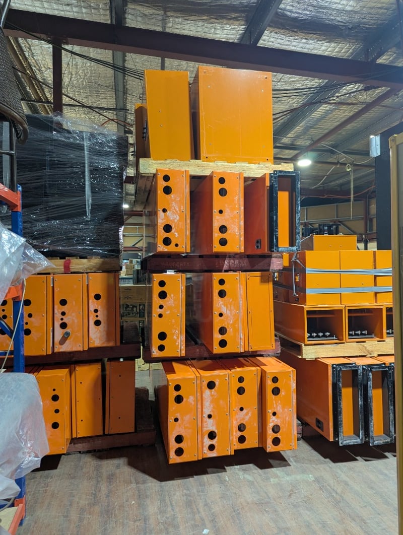 Switchboards, Electrical Cupboards & Copper Wire. Bulk lot comprising multiple industrial electrical enclosures and distribution units. Including orange powder-coated steel cabinets featuring Schneider Electric components, specifically transformer units (TX15, TX16 configurations), bus bar assemblies with mechanical switching mechanisms, and circuit protection equipment. Lot contains approximately 20+ modular enclosure units in varying sizes, complemented by extensive copper cabling shorts approx 1250kg, spent brass terminal lugs, and mechanical fastening components. Sold as lot Contact: Mark David - 0437 318 344