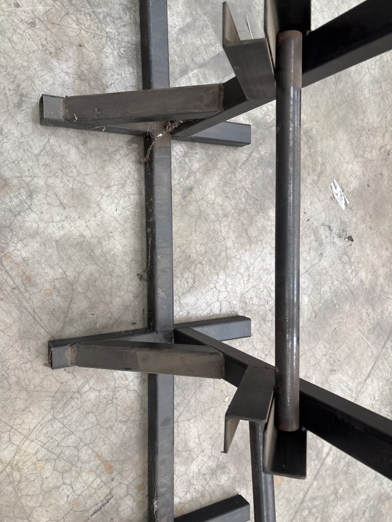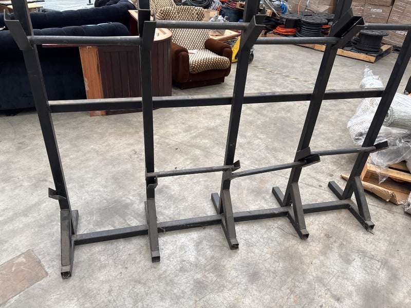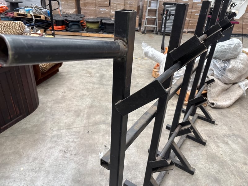 Hydronic hose rack, heavy duty, black, includes steel poles, can store up to 10 Reels. Approx dimensions: 273w X 52d X 153h