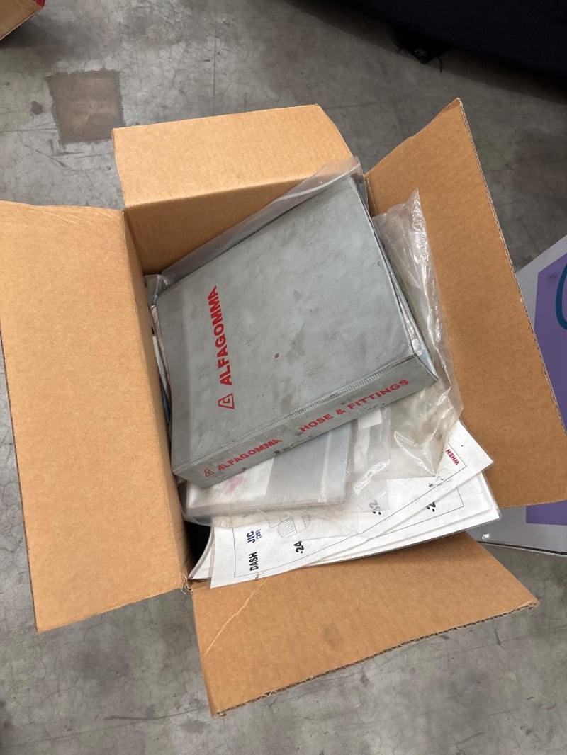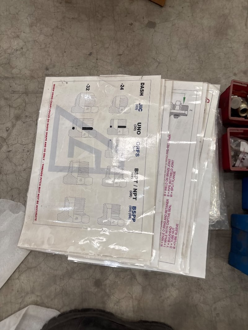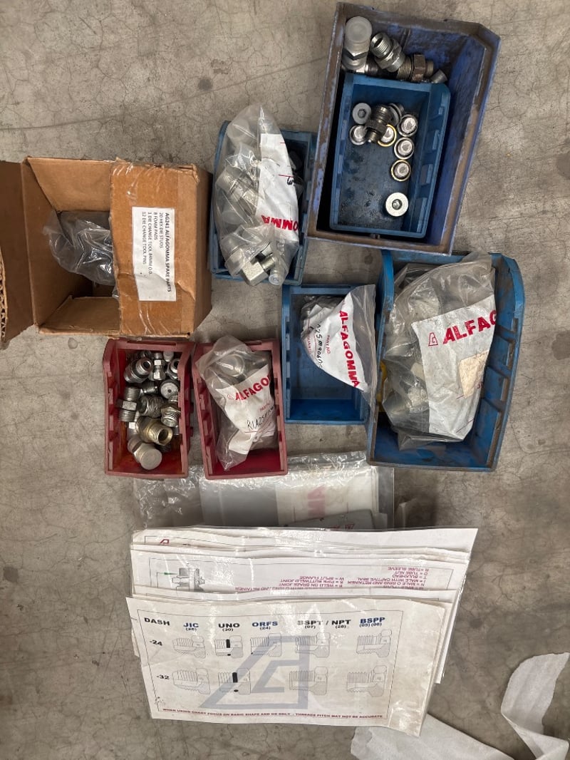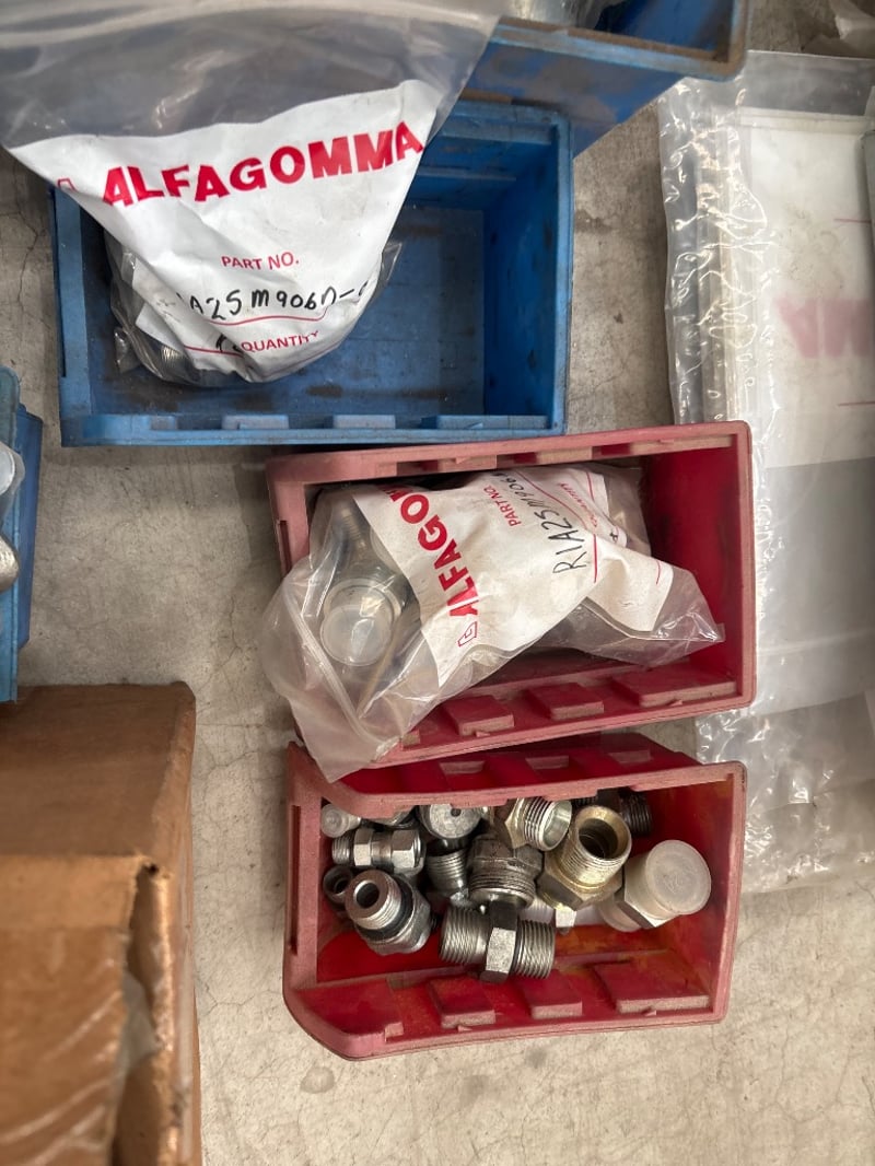 Hose fittings, alfagomma, various types/sizes, includes size charts, also includes some spare parts, including foam pads. Sold as lot.