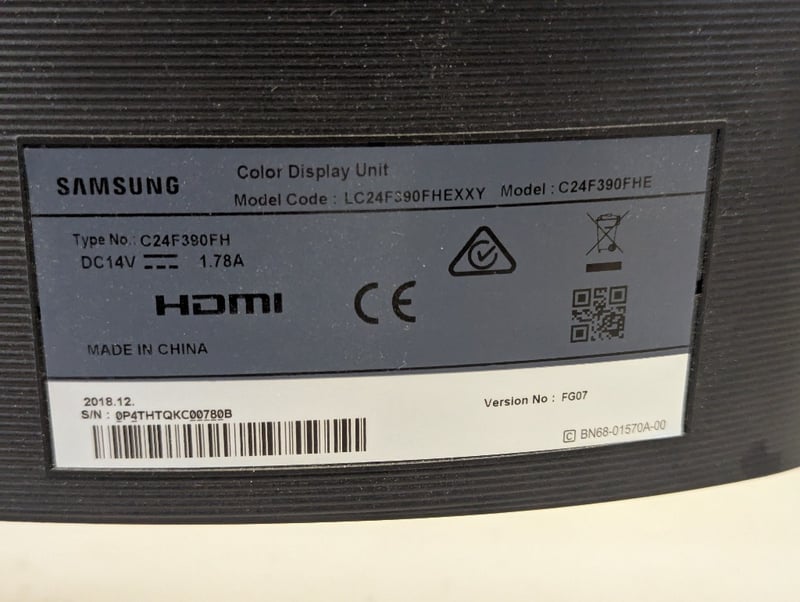 Monitor, Samsung, model: C24F390FHDimensions: H 42cm x W 55cm x D 21cmNote: no power cable supplied