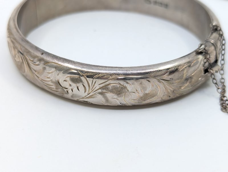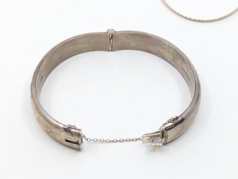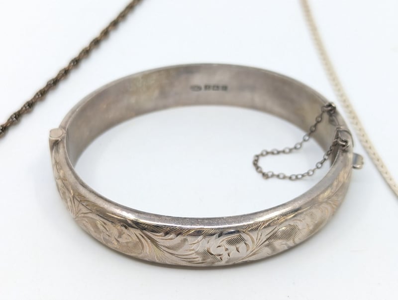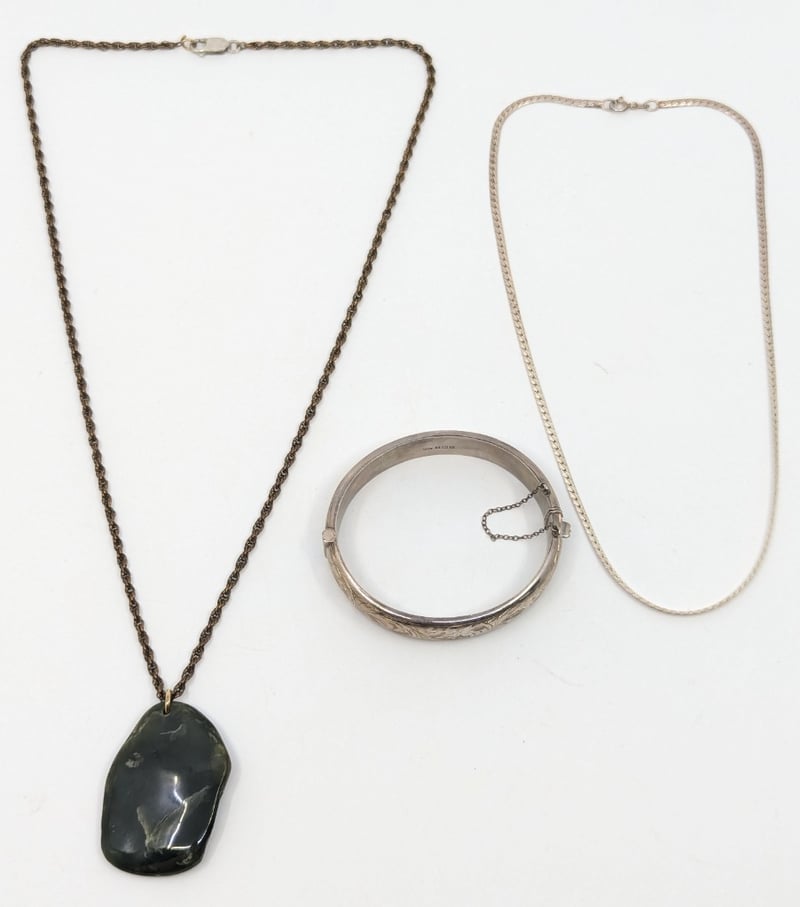 THREE JEWELLERY PIECES INCLUDING NECKLACES AND BANGLEIncludes: Necklace With Green Stone Pendant,Snake Chain Stamped 925,Bangle With Ornate Floral Style Design Around ExteriorMarkings: Necklaces Stamped: 925, Bangle Stamped With HallmarksCondition: Good - Refer To ImagesVAULT5857895+14