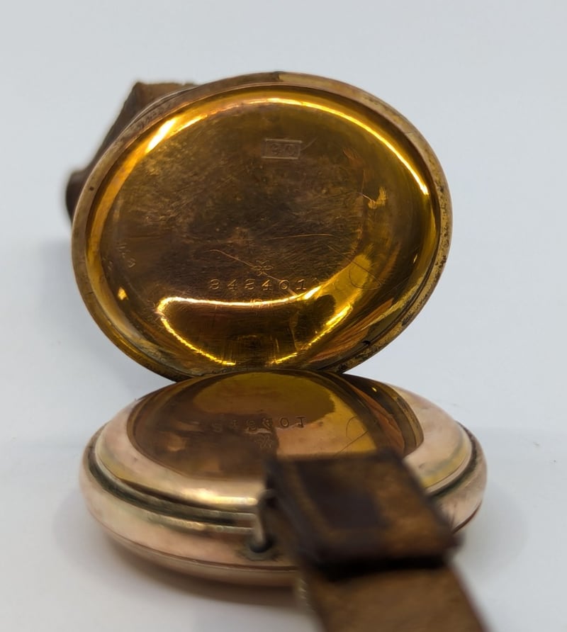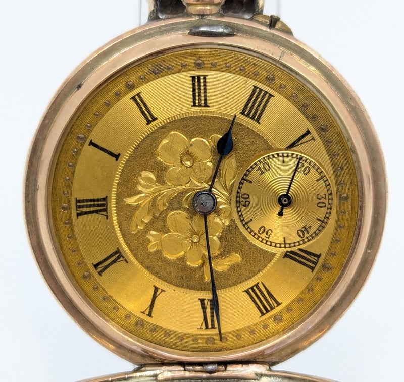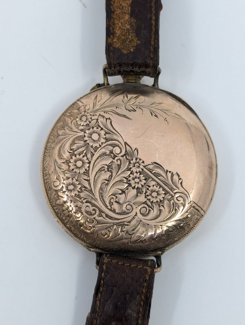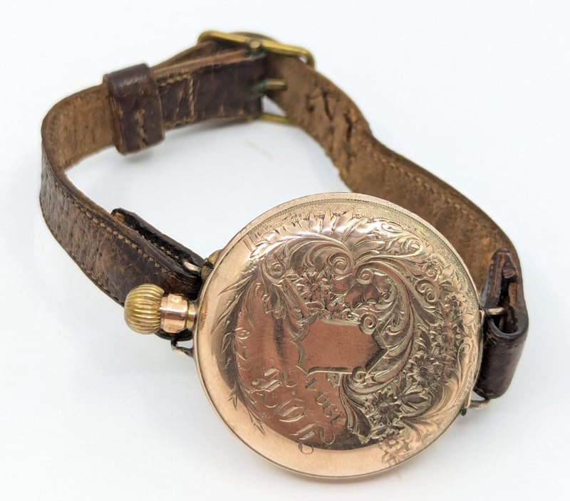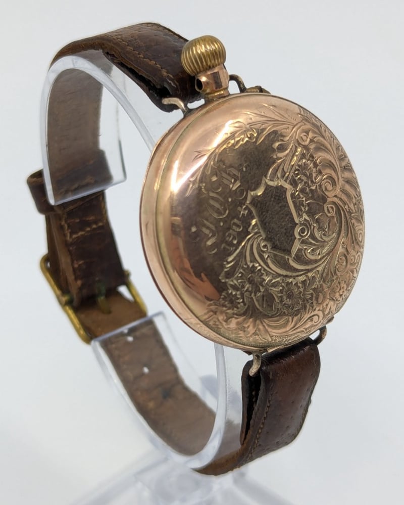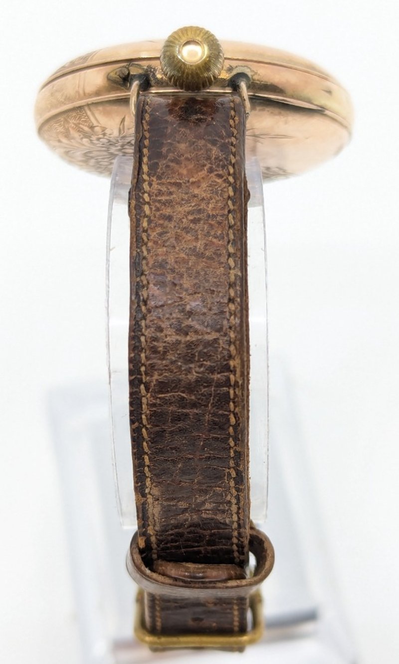 Roman Numeral Hour Markers, Floral Style Imagery On Centre Dial, Watch Case Inscribed 'J.O.B 1904' With Floral Imagery, Leather Bracelet With Buckle Clasp