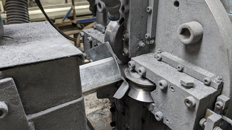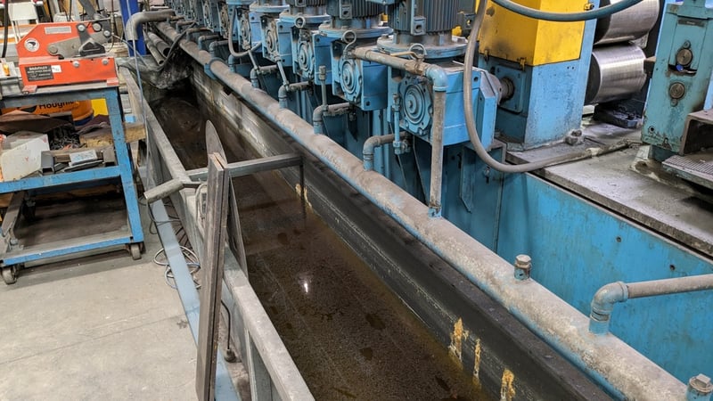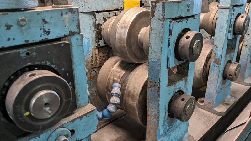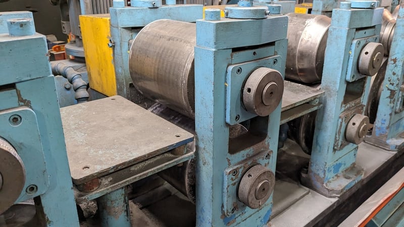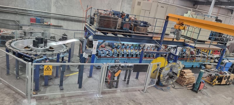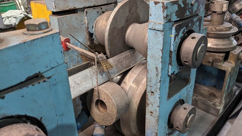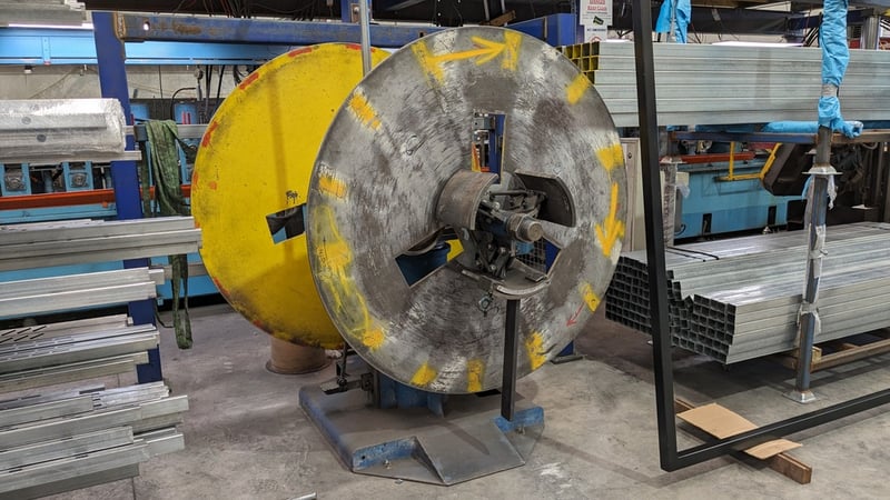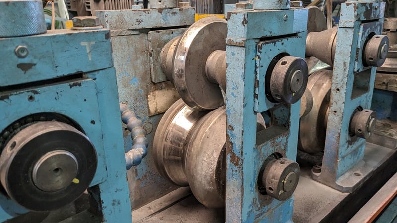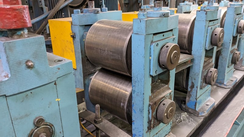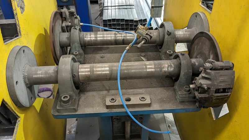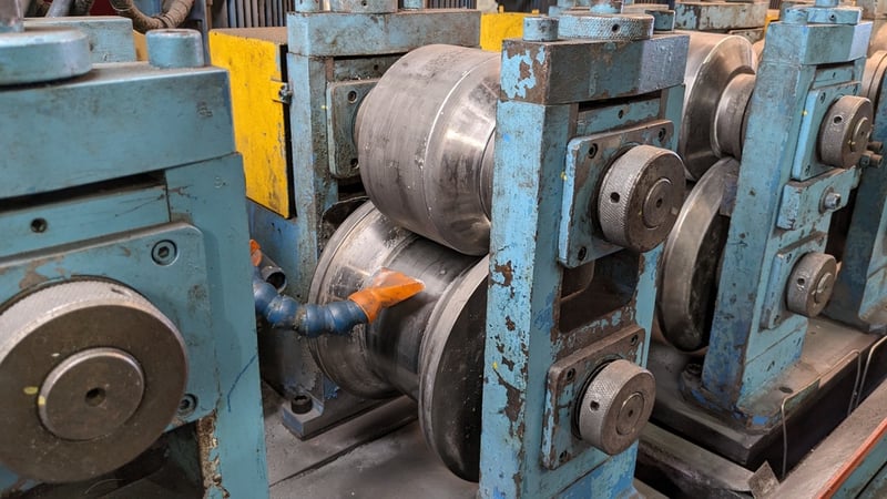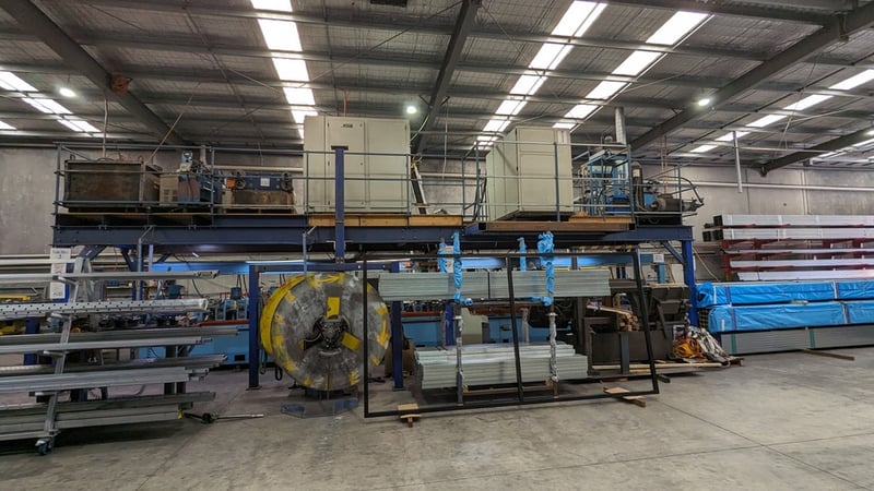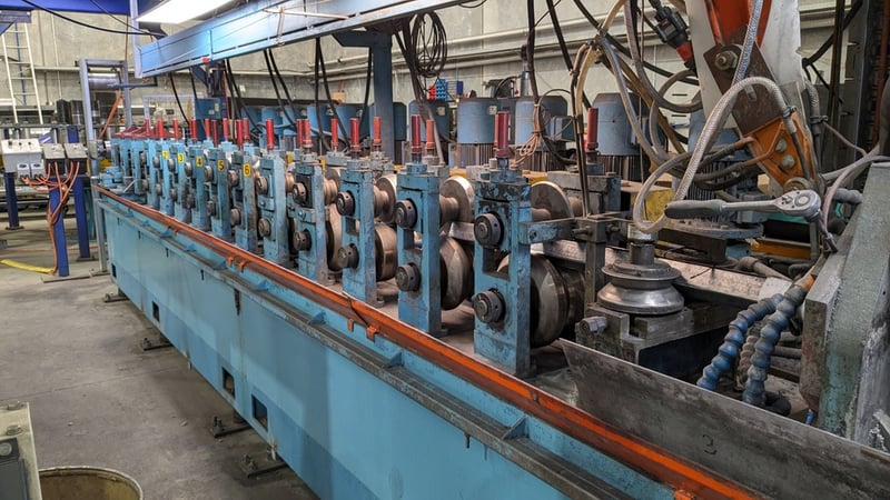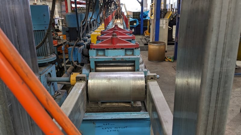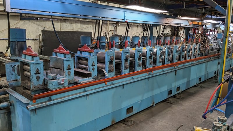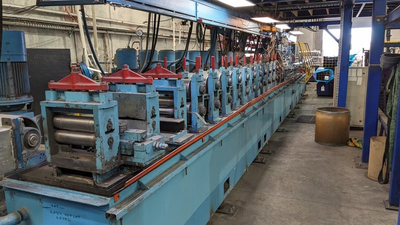 Galvanised Steel Square Tube Production Mill, Produced from Steel Coils, The Assembly line includes a Rotating Coil Feeder (Holds 2 x Coils), Coil Cutter and Welder, Runners to feed Coils, Coil Storage Wheel, Moulding Assembly with 14 Moulding Rollers to bend Coil to shape, Welding Station to Join Seem, Scraper to remove excess Weld, Galvaniser to Galvanise Seam, Leveler and Straightener, Cutting Station, Assembly also includes Cooling System for Seam Welder.