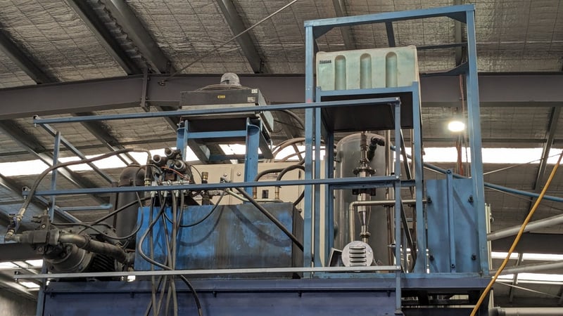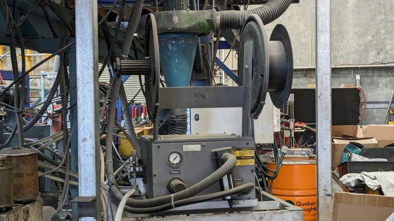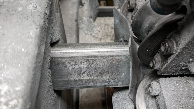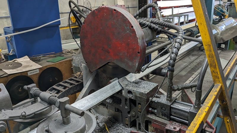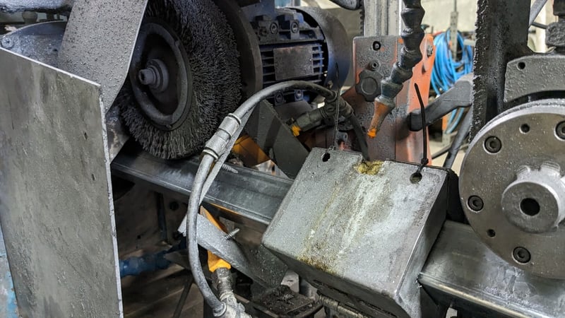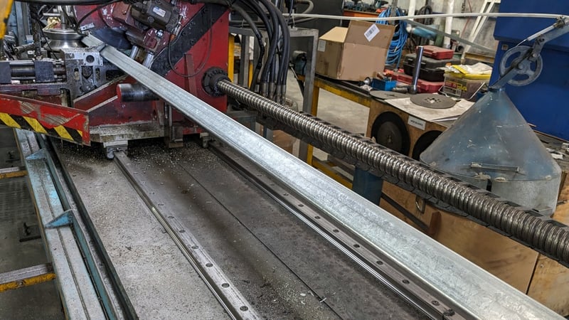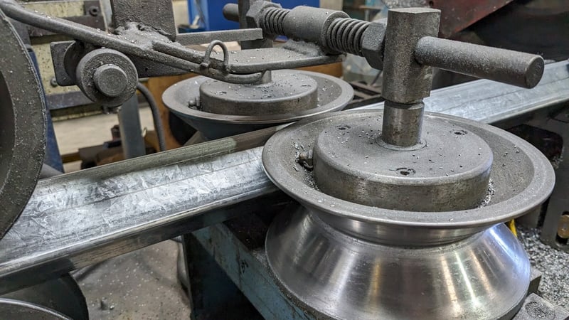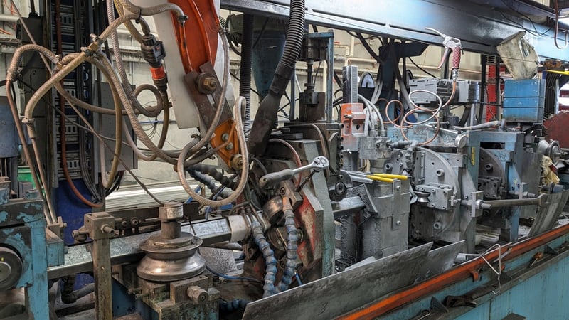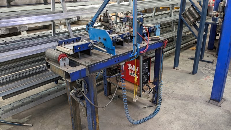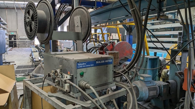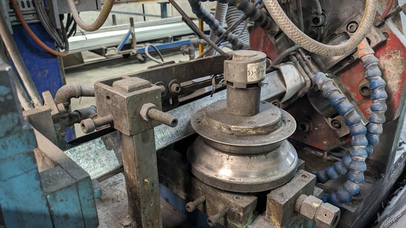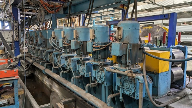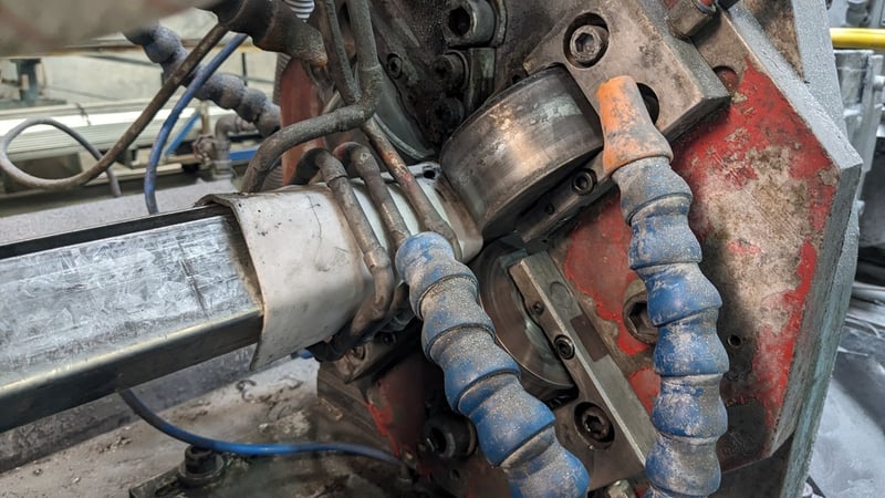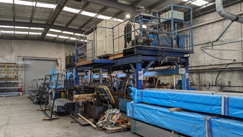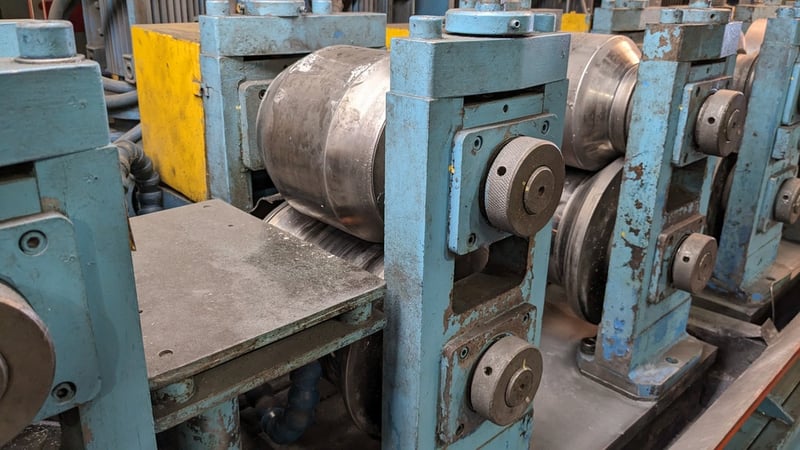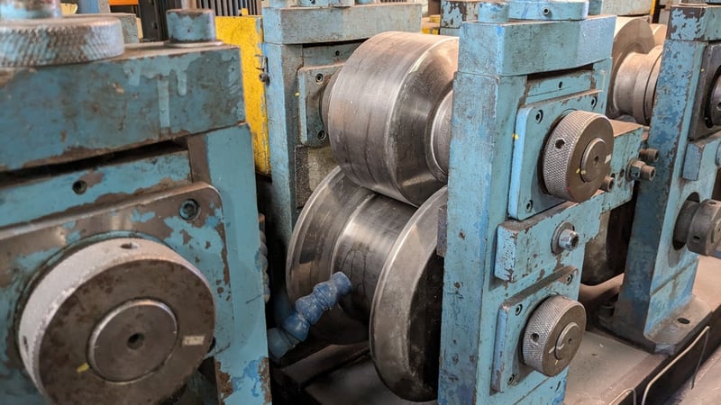 Galvanised Steel Square Tube Production Mill, Produced from Steel Coils, The Assembly line includes a Rotating Coil Feeder (Holds 2 x Coils), Coil Cutter and Welder, Runners to feed Coils, Coil Storage Wheel, Moulding Assembly with 14 Moulding Rollers to bend Coil to shape, Welding Station to Join Seem, Scraper to remove excess Weld, Galvaniser to Galvanise Seam, Leveler and Straightener, Cutting Station, Assembly also includes Cooling System for Seam Welder.