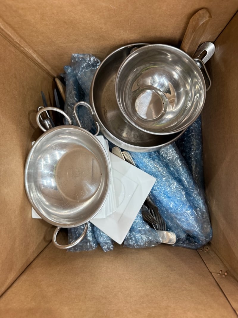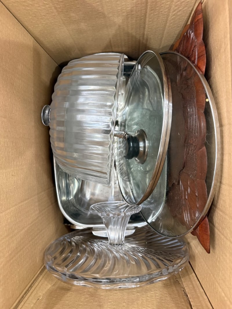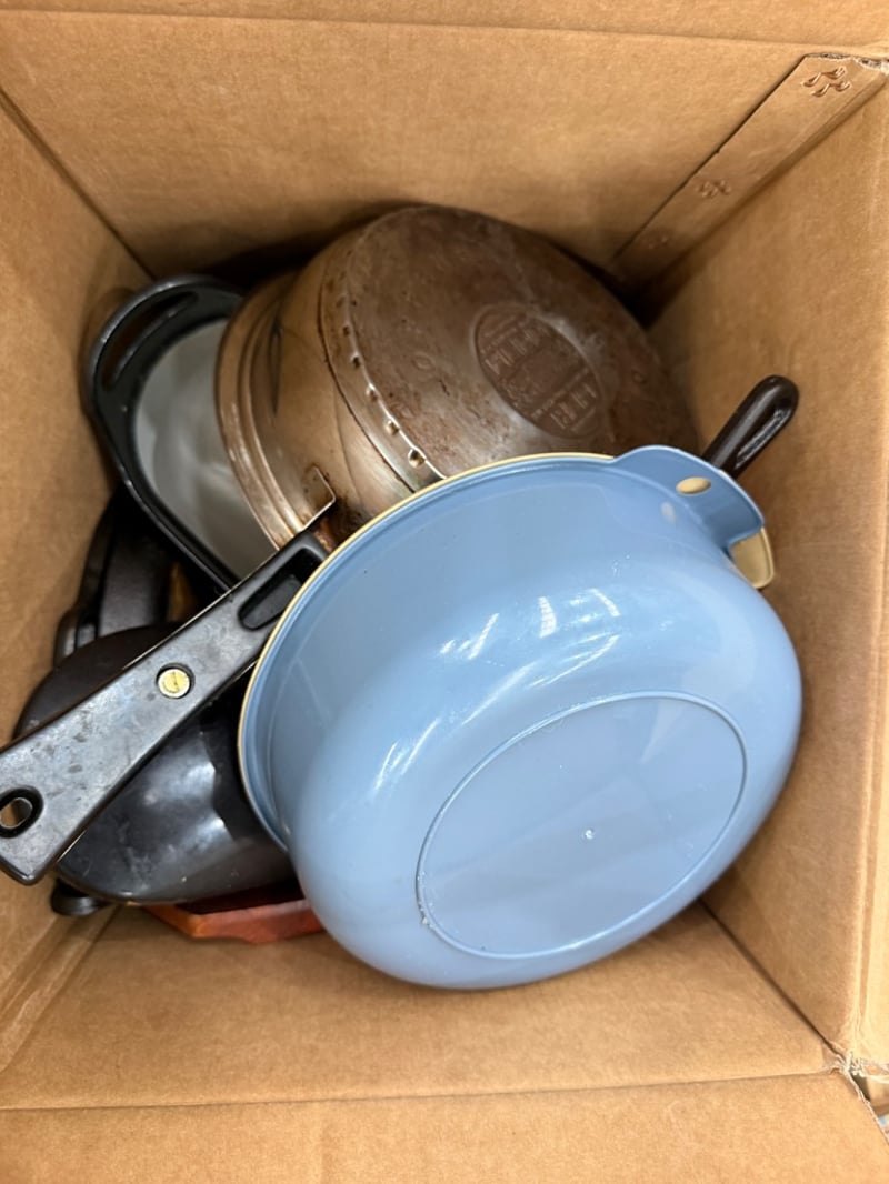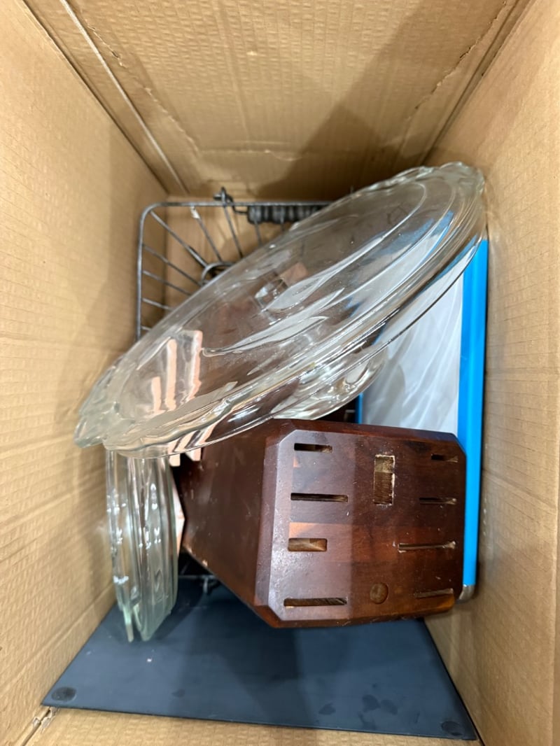 Assorted House hold items, including tea box, pots, glasses, kettle, pot lids, cutlery, pans ect.