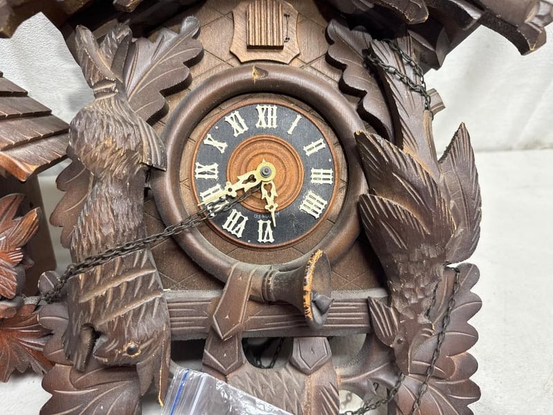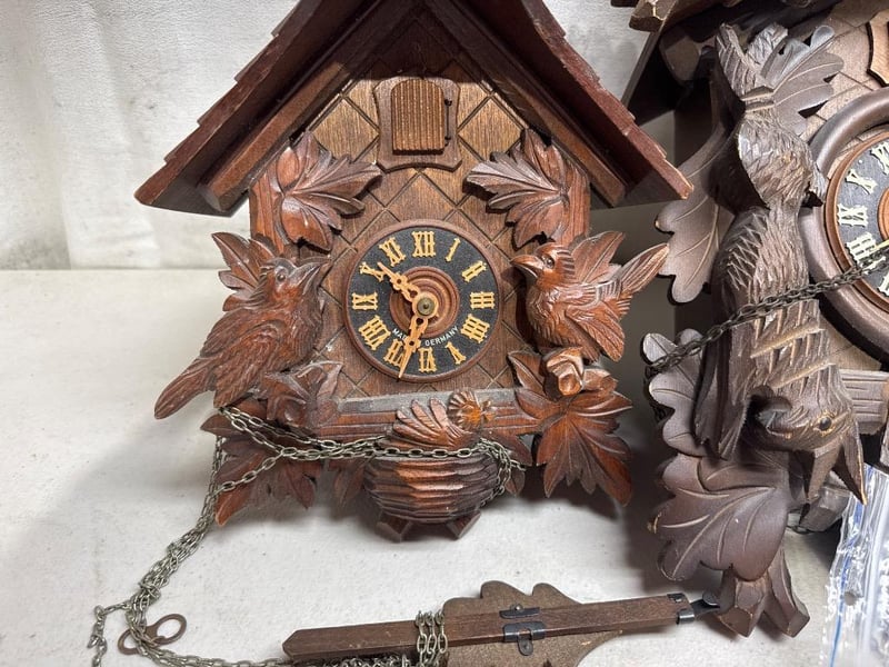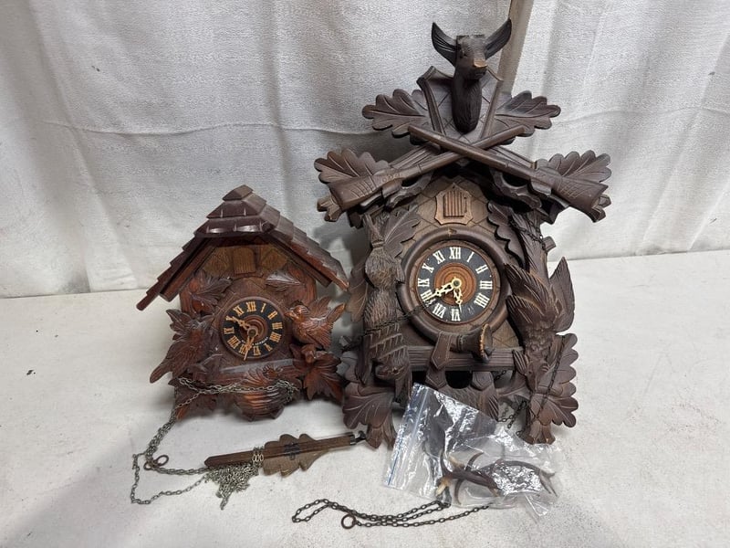 2x vintage black forest cuckoo clock, circa 1950, made in Germany, carved wood