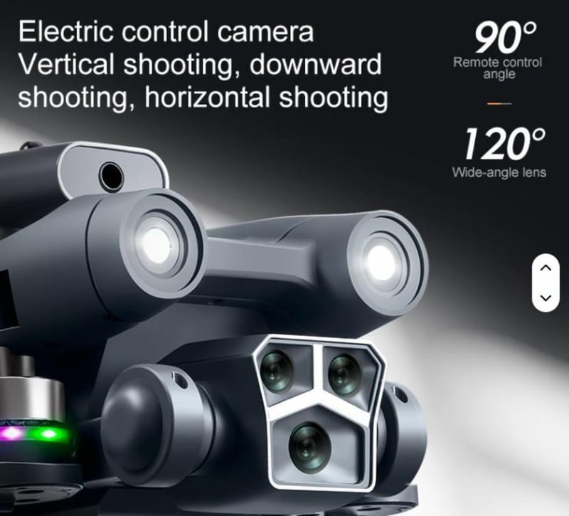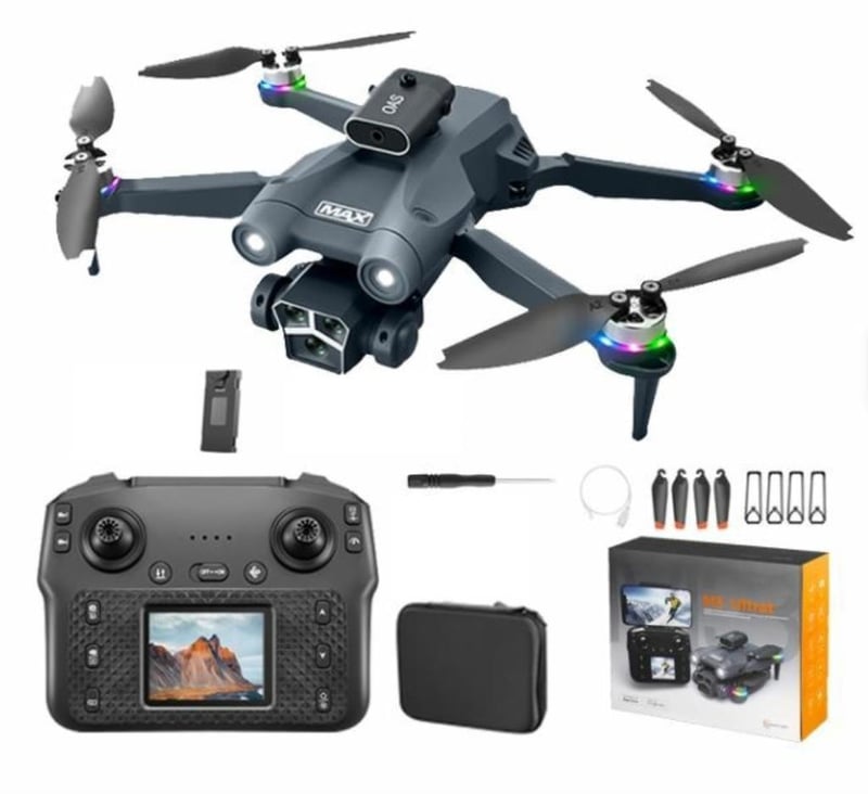 FPV Quadcopter Drone Dual HD Cameras FPV Mobile Phone APP View & Control Remote HD Front Camera & HD Bottom Camera(Front Camera has 3 Lenses for Multiple Angle Shooting) LCD Screen Improved Image Quality Adjustment 2.4GHZ Wi-Fi 4 Channel 22cm x 27cm unfolded 3Way Automatic 360 Degree Obstacle Avoidance Auto Trajectory Flying 3D Flip Approx 100 Metre Drone Control Spare Blades Zipper Close Storage Bag One-Key Take-off and Landing 360-degree Hover Mode LED Flying Lights Long Fly Time EXTRA DRONE BATTERY FOR EXTENDED USE. Batteries for remote not included (NEW IN BOX) BLACK