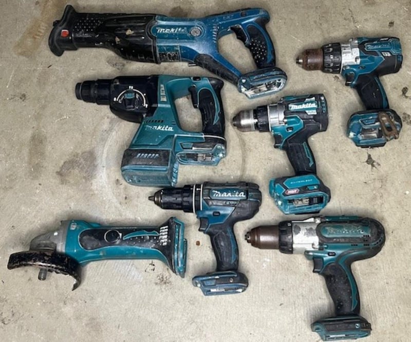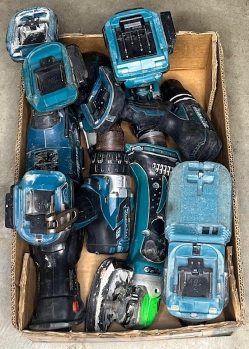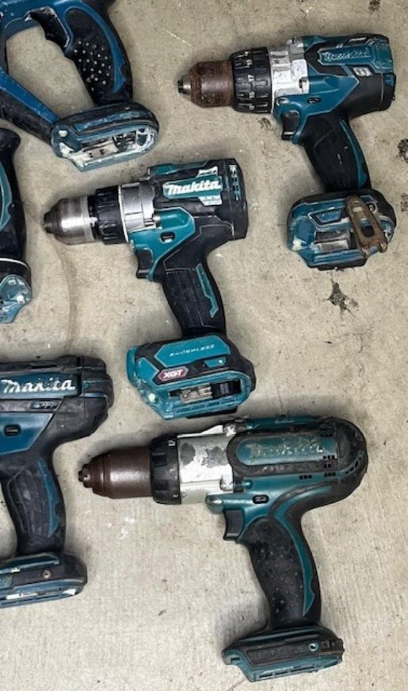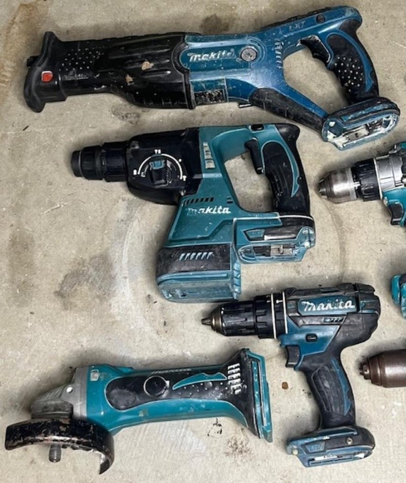 Cordless Makita tools. 1 x DHP481 hammer drill (18V), 1 x DHP482 hammer drill (18V), 1 x BDF451 drill (18V), 1 x DF001G hammer drill (36V), 1 x DGA452 angle grinder (18V), 1 x BJR181 reciprocating saw (18V), 1 x rotary hammer drill (18V). Skins only, no batteries. Condition: Not working, untested, for parts or repair.