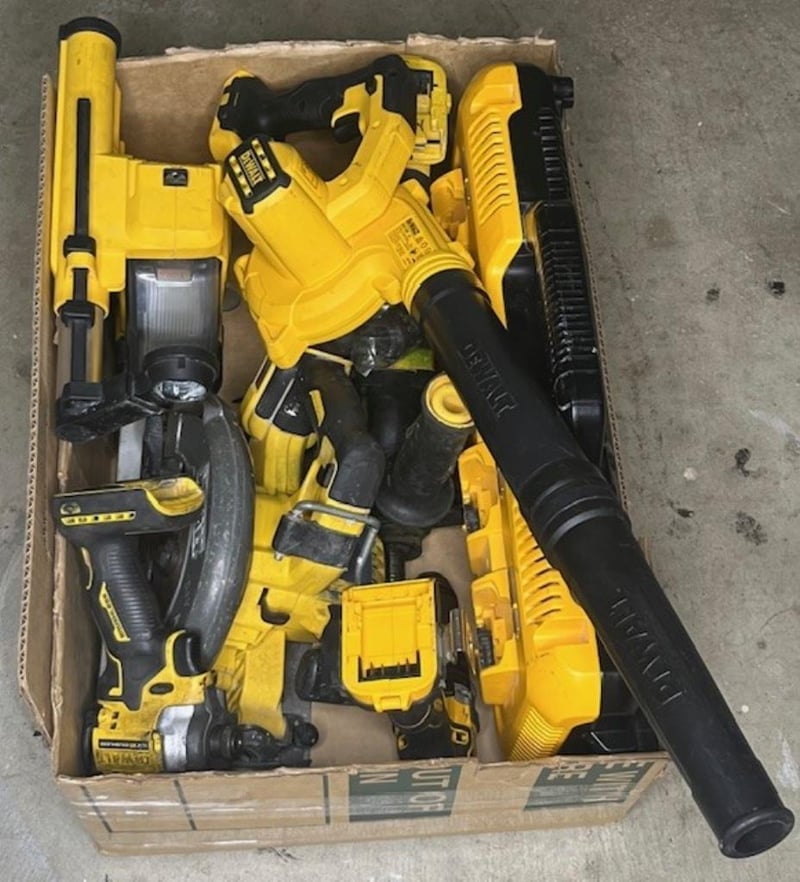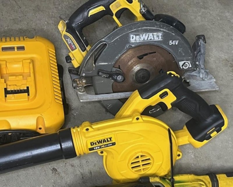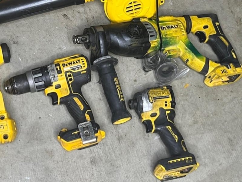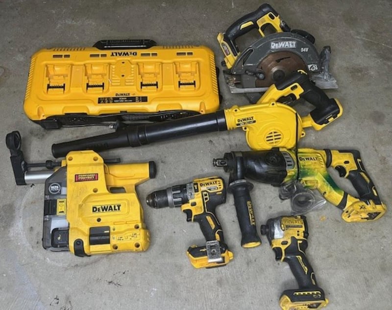 Cordless DeWalt 18V tools. 1 x DCH263 rotary hammer drill, 1 x DCF850 impact driver, 1 x DCS575 XE circular saw, 1 x D25304DH hammer vac, 1 x DCV100 XE mini blower, 1 x DCD796 XE hammer drill, 1 x DCB104 4 port charger. Skins only, no batteries. Condition: Not working, untested, for parts or repair.