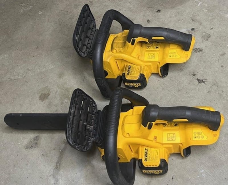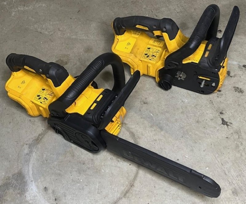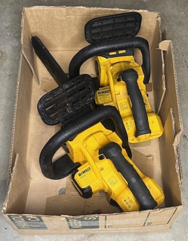 Cordless DeWalt 18V chainsaws. 2 x DCM565 XE. Skins only, no batteries. Condition: Not working, untested, for parts or repair.