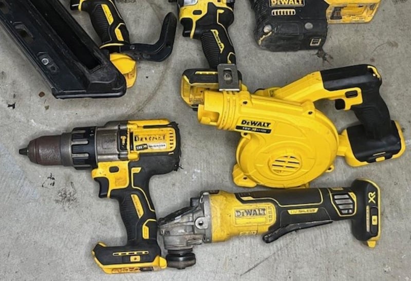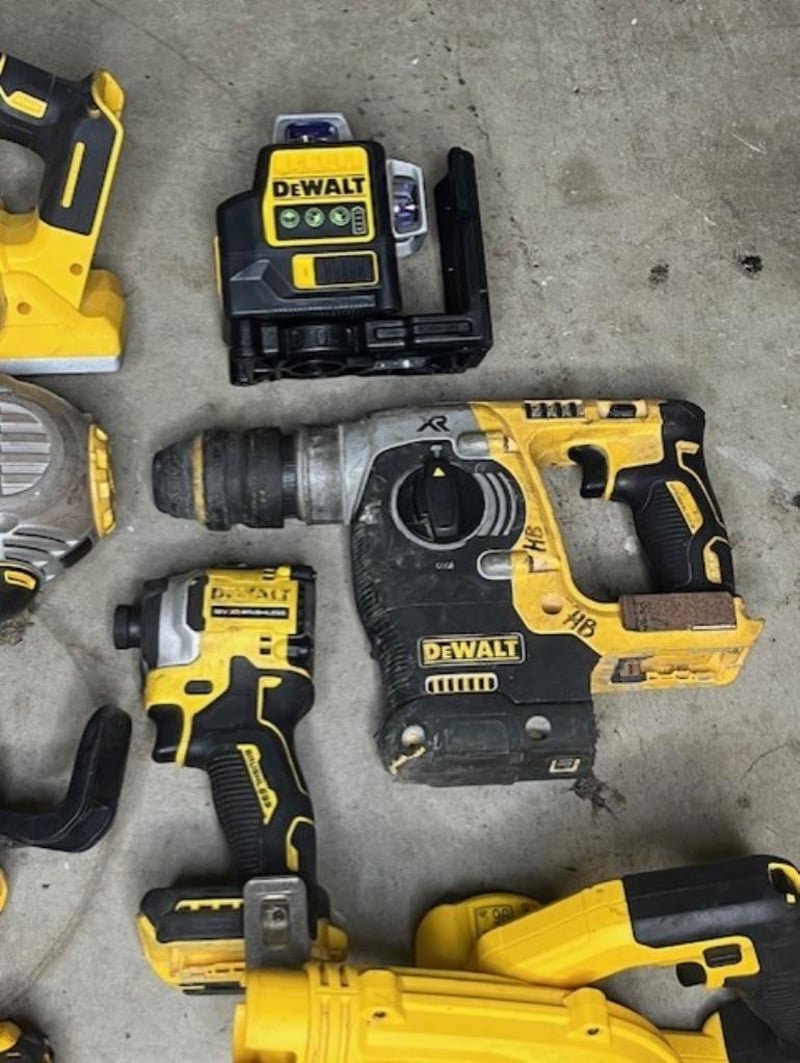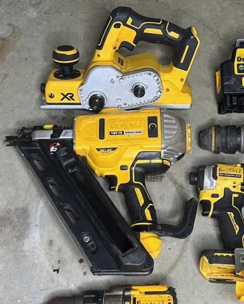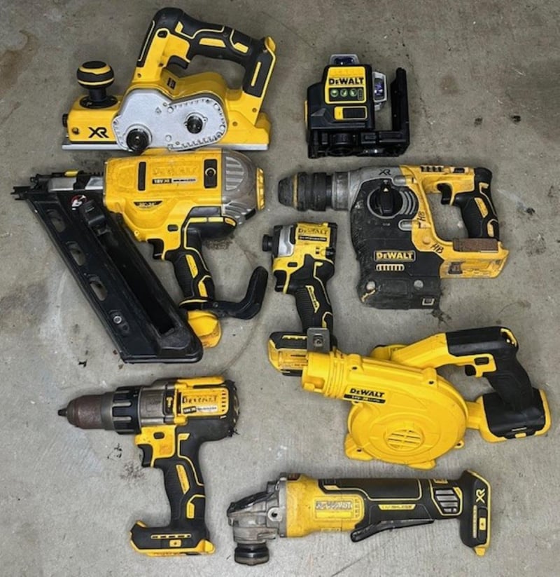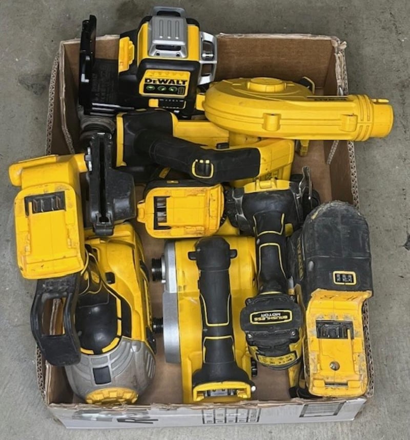 Cordless DeWalt 18V tools. 1 x DCP580 XE planer, 1 x DCN692 nailer, 1 x DCE089G laser level, 1 x rotary hammer drill, 1 x DCF850 impact driver, 1 x DCV100 XE mini blower, 1 x DCD996 XE hammer drill, 1 x DCG406 angle grinder. Skins only, no batteries. Condition: Not working, untested, for parts or repair.