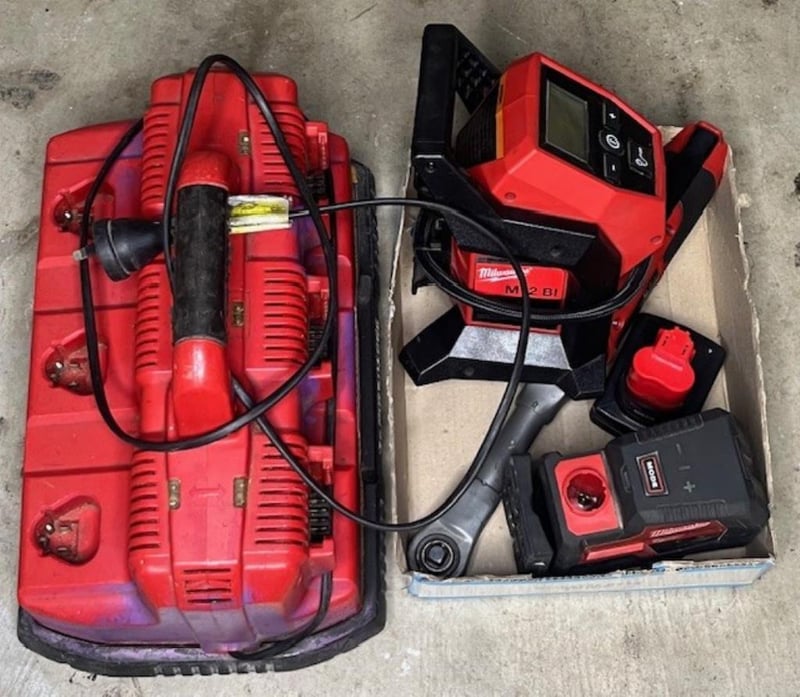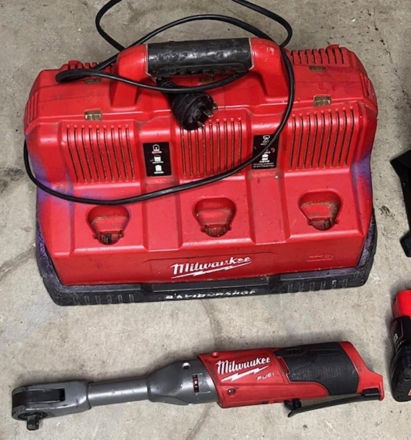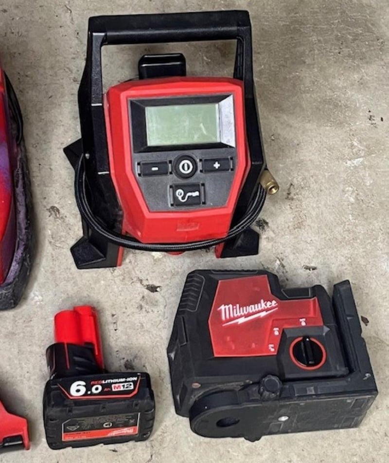 Cordless Milwaukee 12V tools. 1 x M12 BI inflator, 1 x L4CLL laser level (4V), 1 x M12 B6 6Ah battery, 1 x M12 FIR38LR impact wrench, 1 x M12-18C3 6 port charger. Skins only, no batteries. Condition: Not working, untested, for parts or repair.