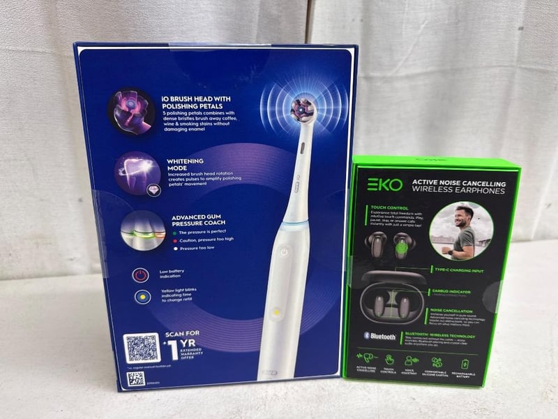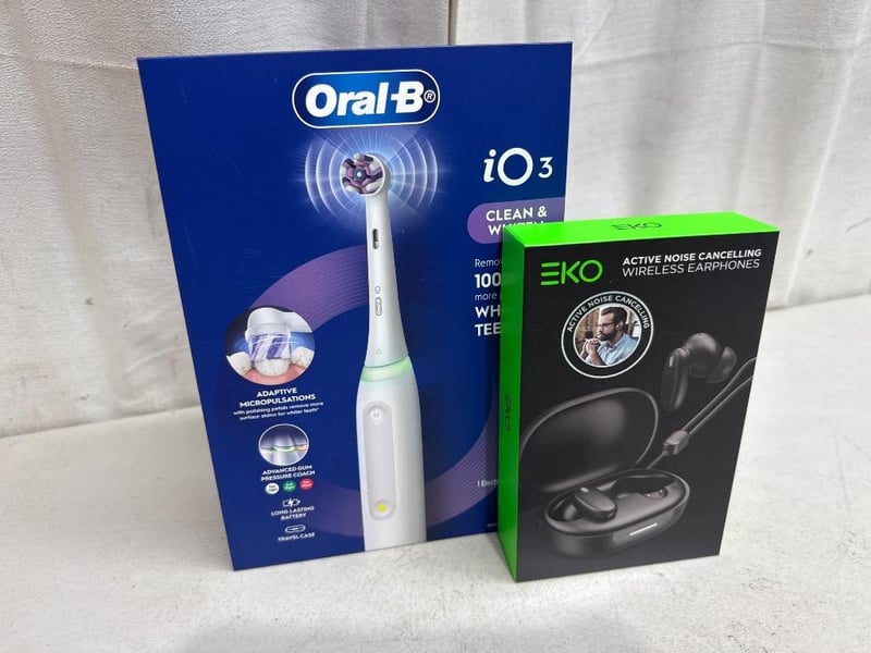 1x Oral-B IO3 rechargeable electric toothbrush, RRP $99.95, Factory sealed in box, 1x EKO bluetooth active noise cancelling wireless earphones, touch control, factory sealed in box