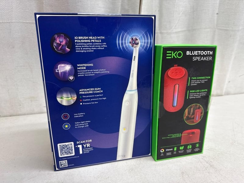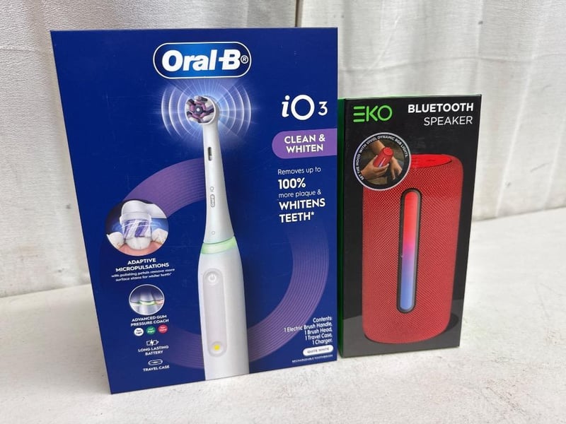 1x Oral-B IO3 rechargeable electric toothbrush, RRP $99.95, Factory sealed in box, 1x EKO bluetooth speaker with RGB lights, factory sealed in box