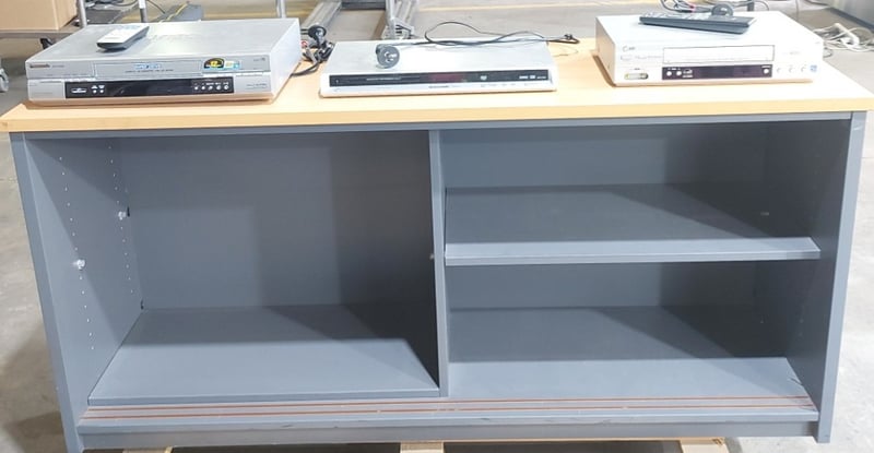 TV unit with storage,Dims: 70cm H, 150cm W, 45cm DPanasonic VHS player includes control Serial num: A3TB02049Model num: NV-FJ630ALG vHS player includes remoteModel num: GC480WPanasonic CD Player- not included remote Serial num: VA6GA001286RModel num: DVD-S32Sold as lot.