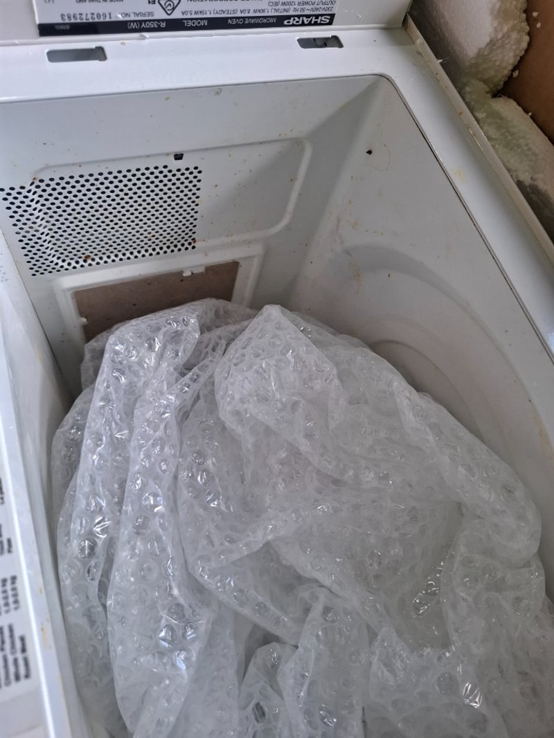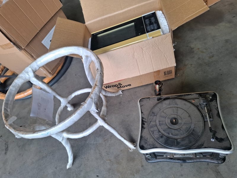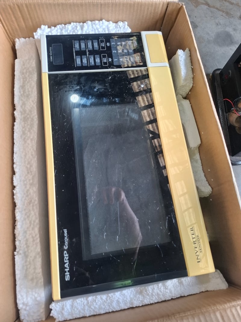 Assortment lot includes Sharp microwave, stainless steel table frame, vintage-style turntable/ phonograph record player