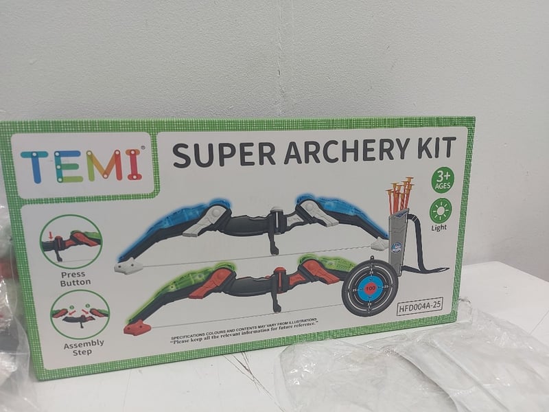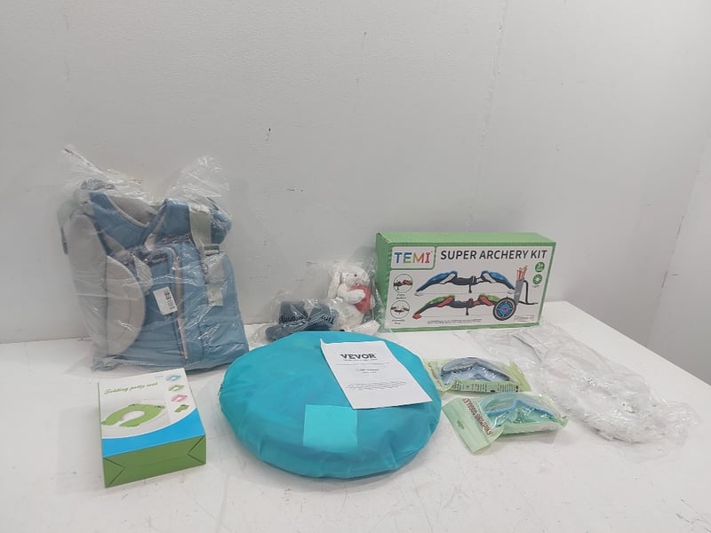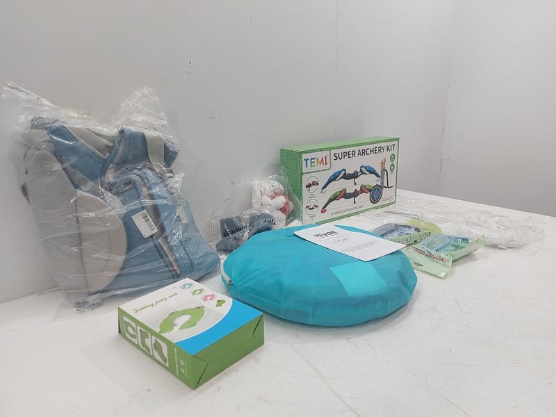 Assorted Kids Lot Includes, Super Archery Kit, Climb Tunnel, Folding Potty Seat, Baby Carryer, Swimming Goggles, And More Quantity As Lot