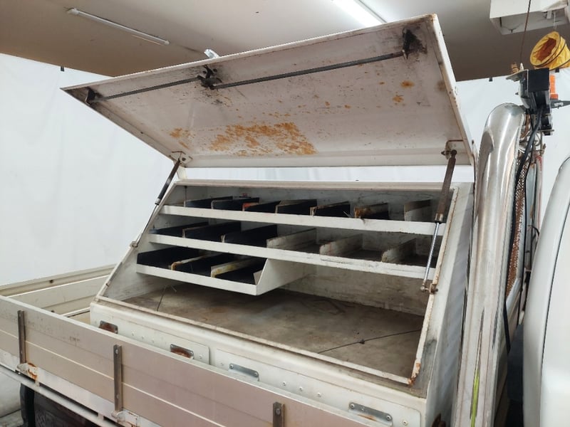 Flat Tray, Storage Toolbox In tray, Half Roll Cage Exterior Panel Dents & Scratches, Rust, Tint Bubble, Interior Panel & Upholstery Damage & Deterioration, FOB Key Does Not Lock (USE Manual Key), Could Not Lock Passenger Side Door.