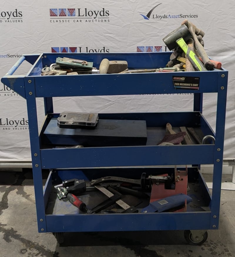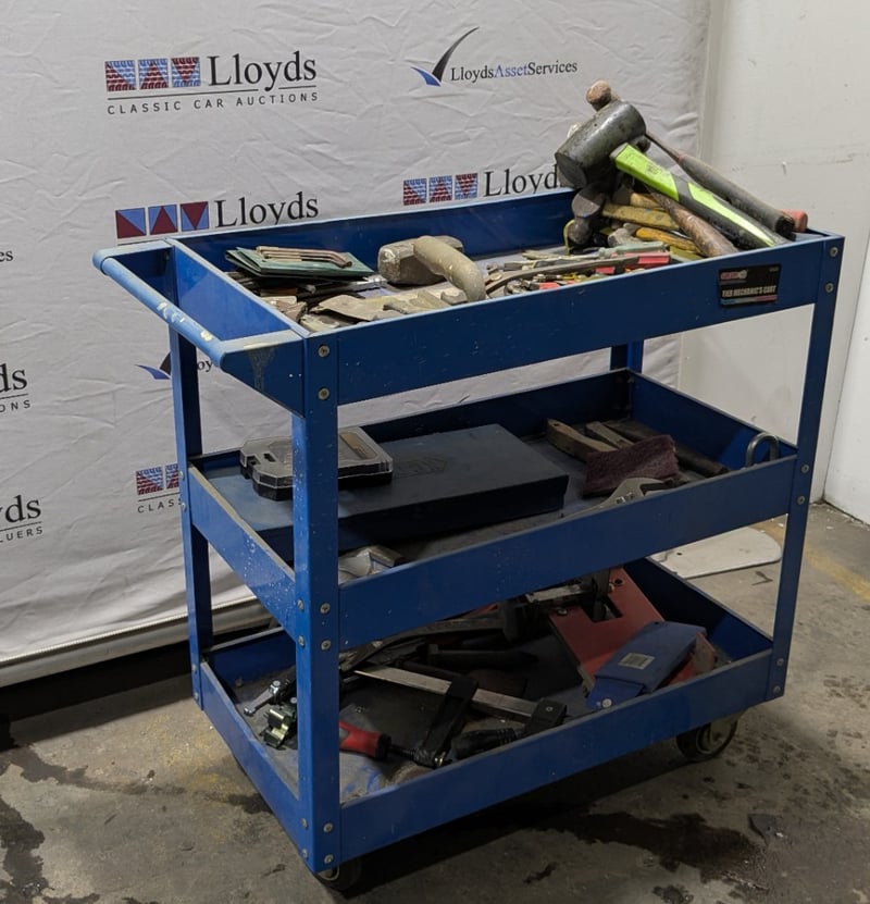 3-tier blue steel mobile tool trolley, tools include - Hammer, chisel, and more...