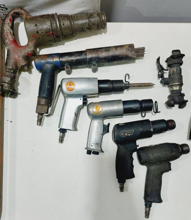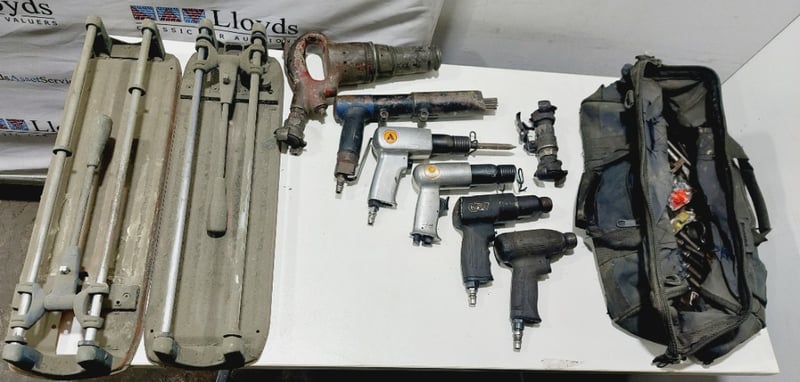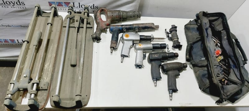Assorted pneumatic (air-powered) industrial tools including, air hammers and needle scaler, manual tile cutters and more...