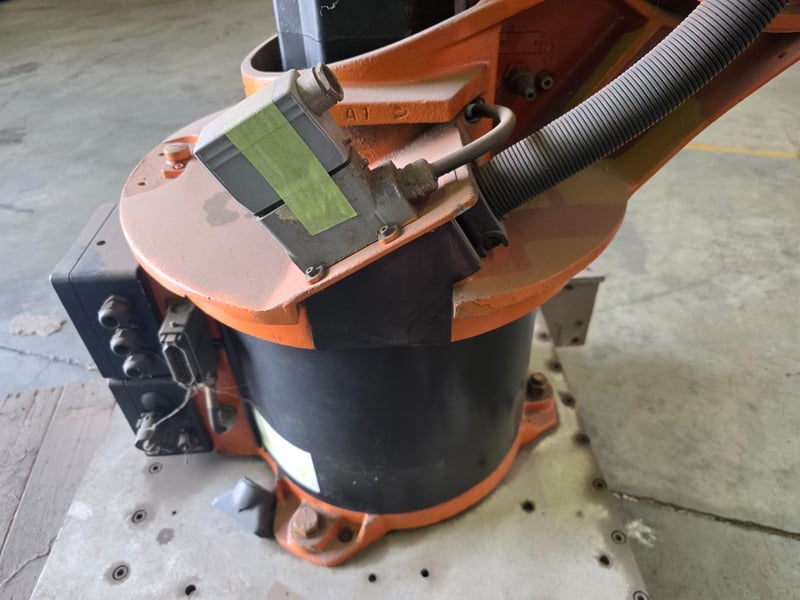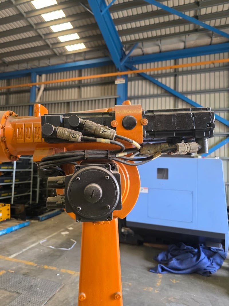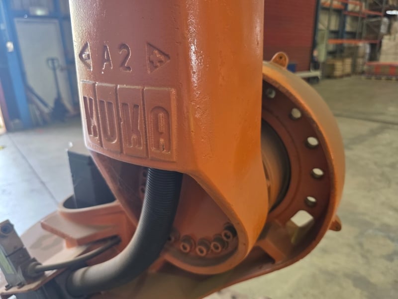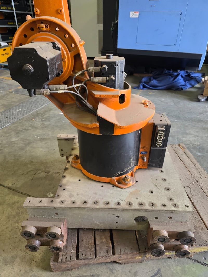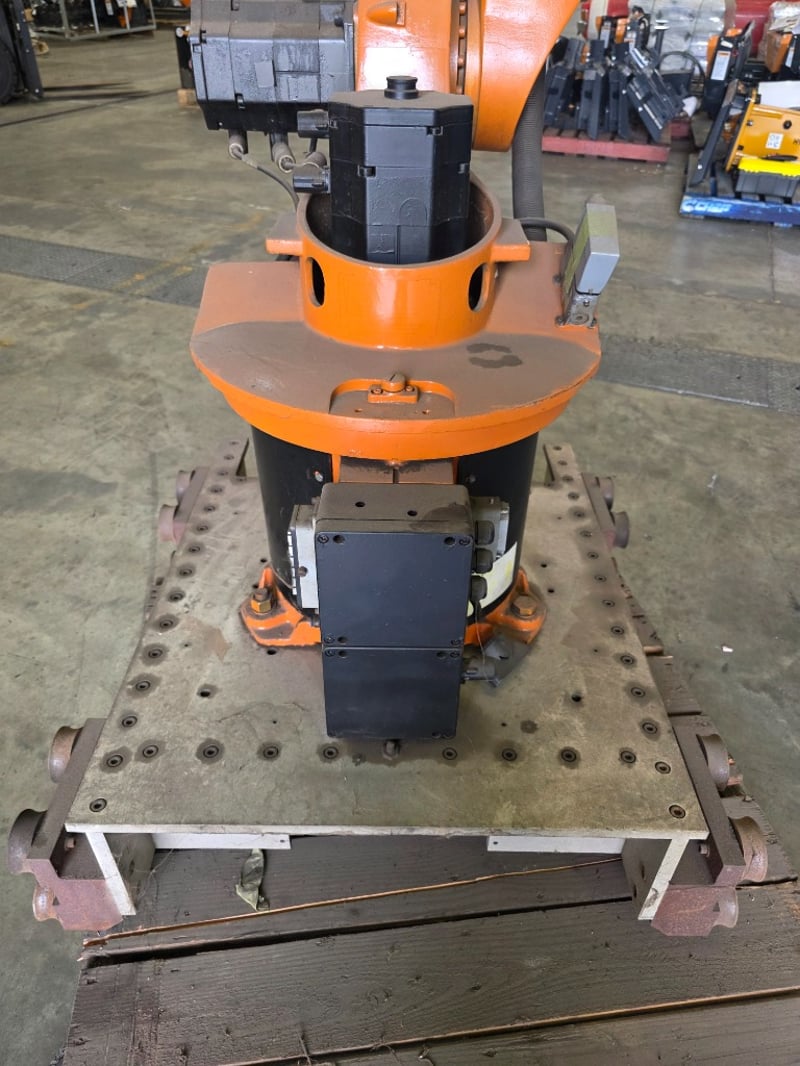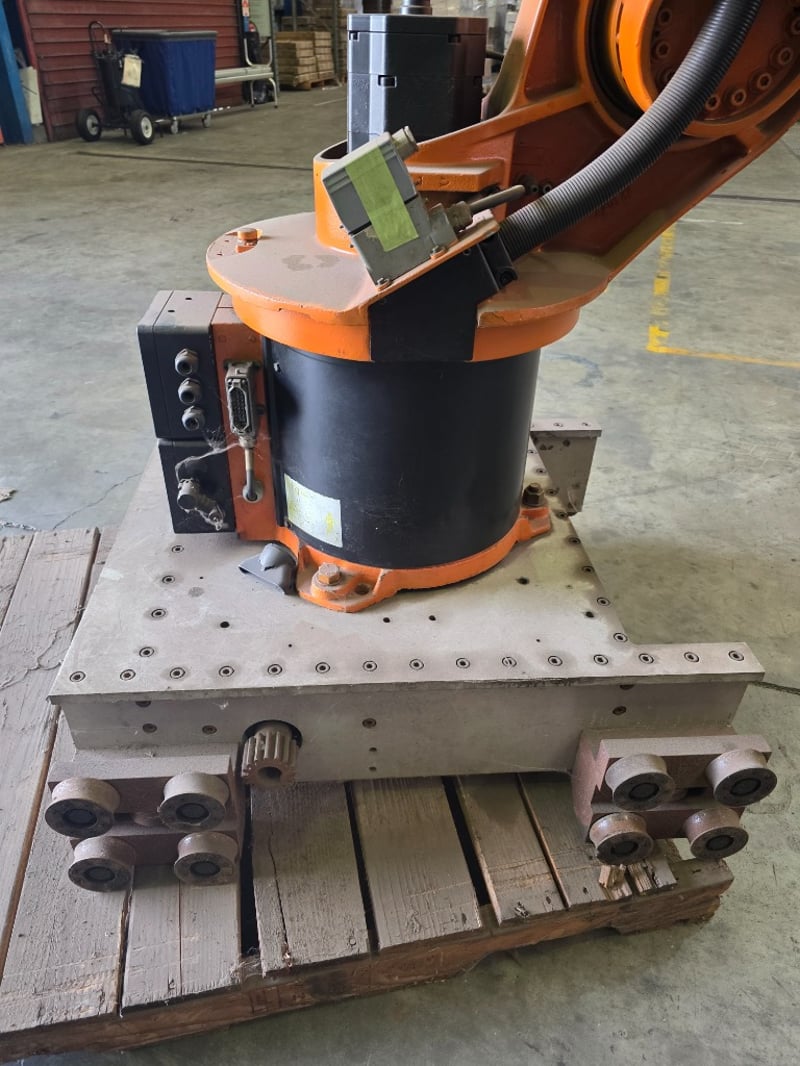 KUKA KR Series 6-axis articulated robot arm, orange powder-coated, mounted on a fabricated mild steel heavy-duty traversing base with integrated roller/wheel bogie assemblies and bolt-down flanges, axis joint markings visible including "A2" cast into upper arm housing; wrist/end-of-arm tooling flange intact with proximity sensors and cabling routed along arm structure, no end effector fitted, general wear and surface scuffing consistent with prior industrial use, operational condition unknown.