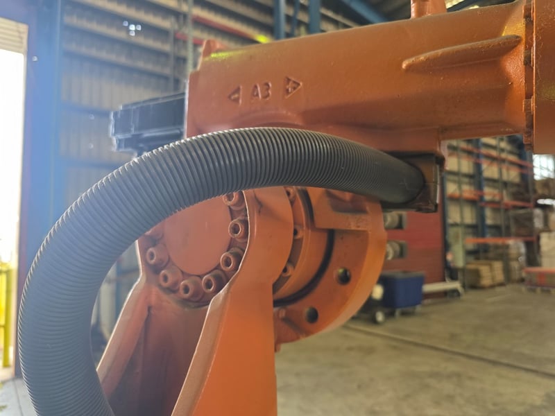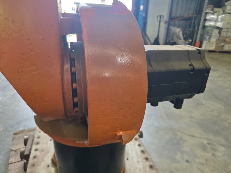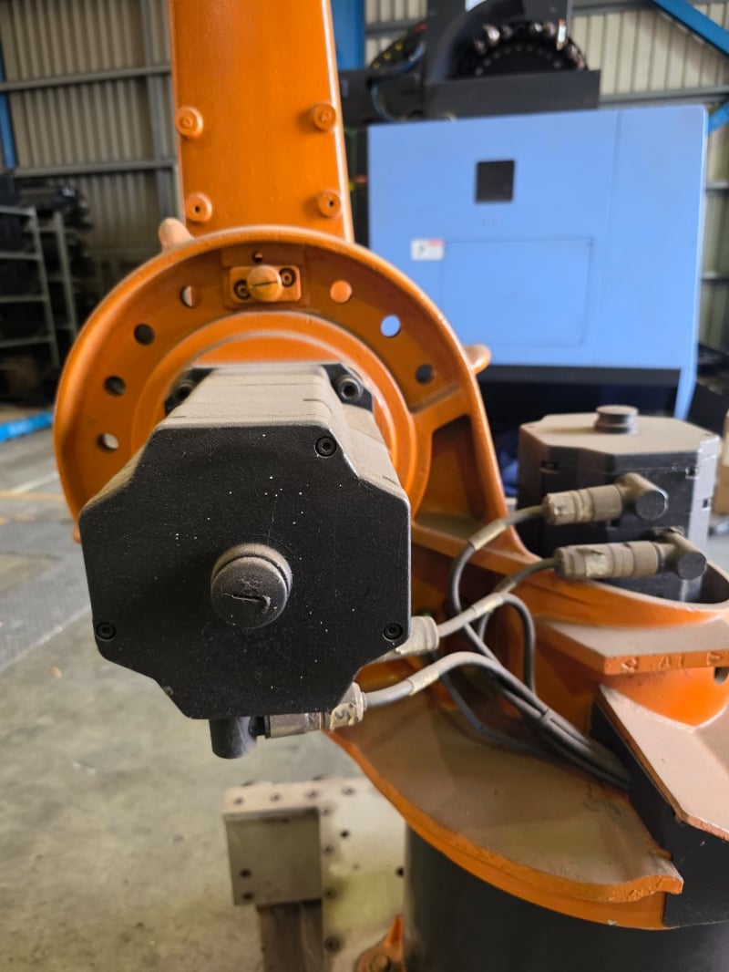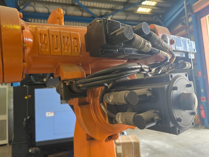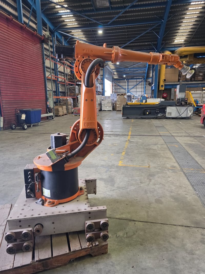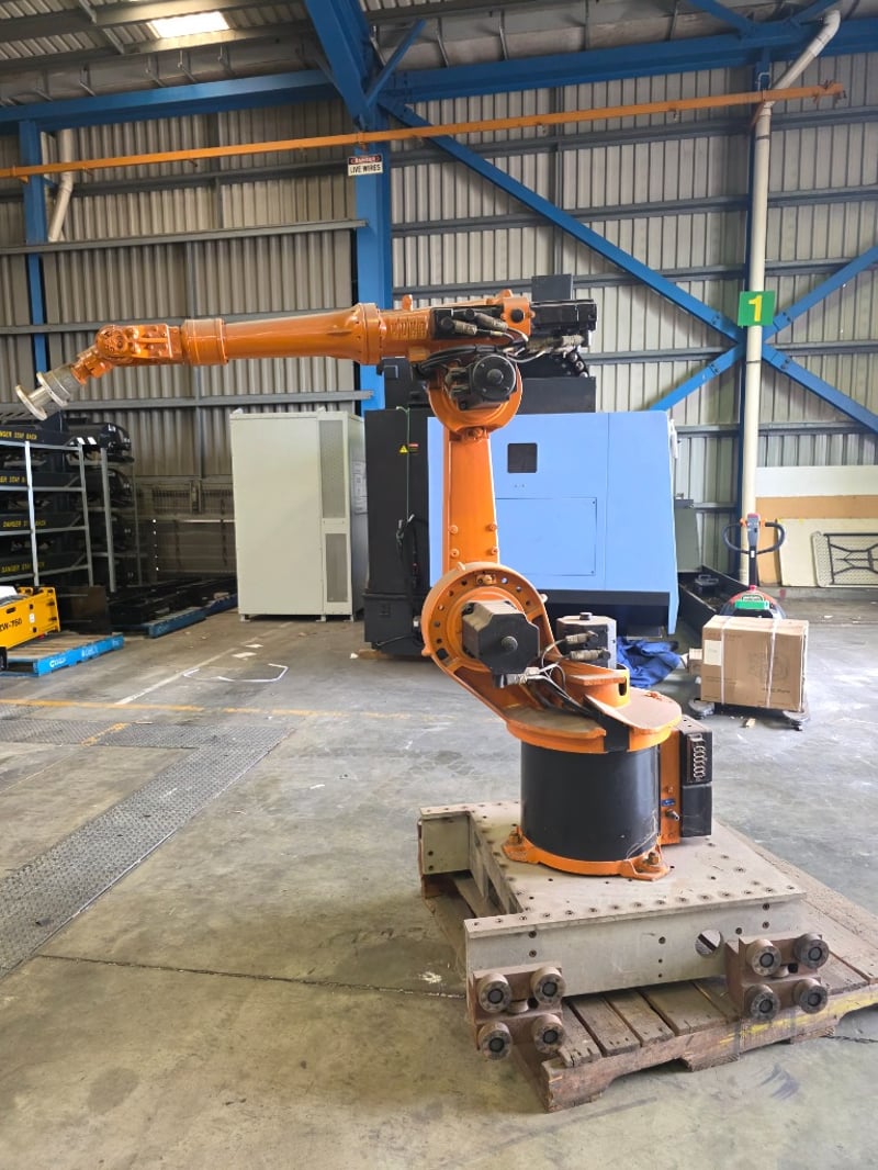 KUKA KR Series 6-axis articulated robot arm, orange powder-coated, mounted on a fabricated mild steel heavy-duty traversing base with integrated roller/wheel bogie assemblies and bolt-down flanges, axis joint markings visible including "A2" cast into upper arm housing; wrist/end-of-arm tooling flange intact with proximity sensors and cabling routed along arm structure, no end effector fitted, general wear and surface scuffing consistent with prior industrial use, operational condition unknown.