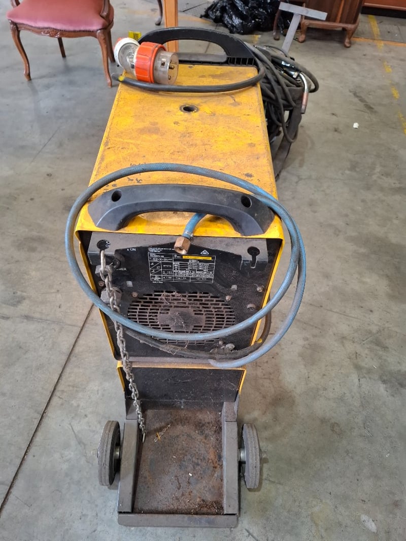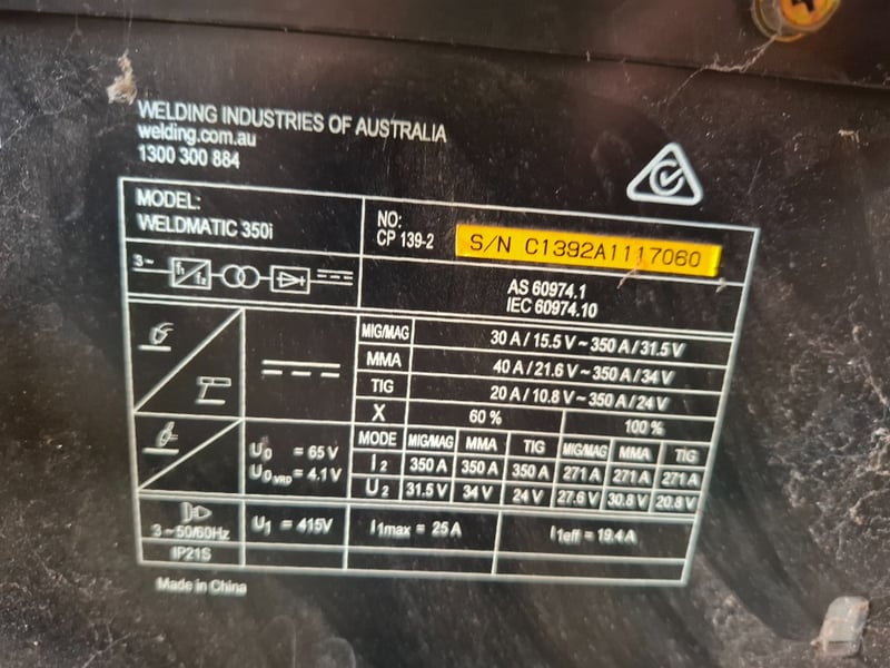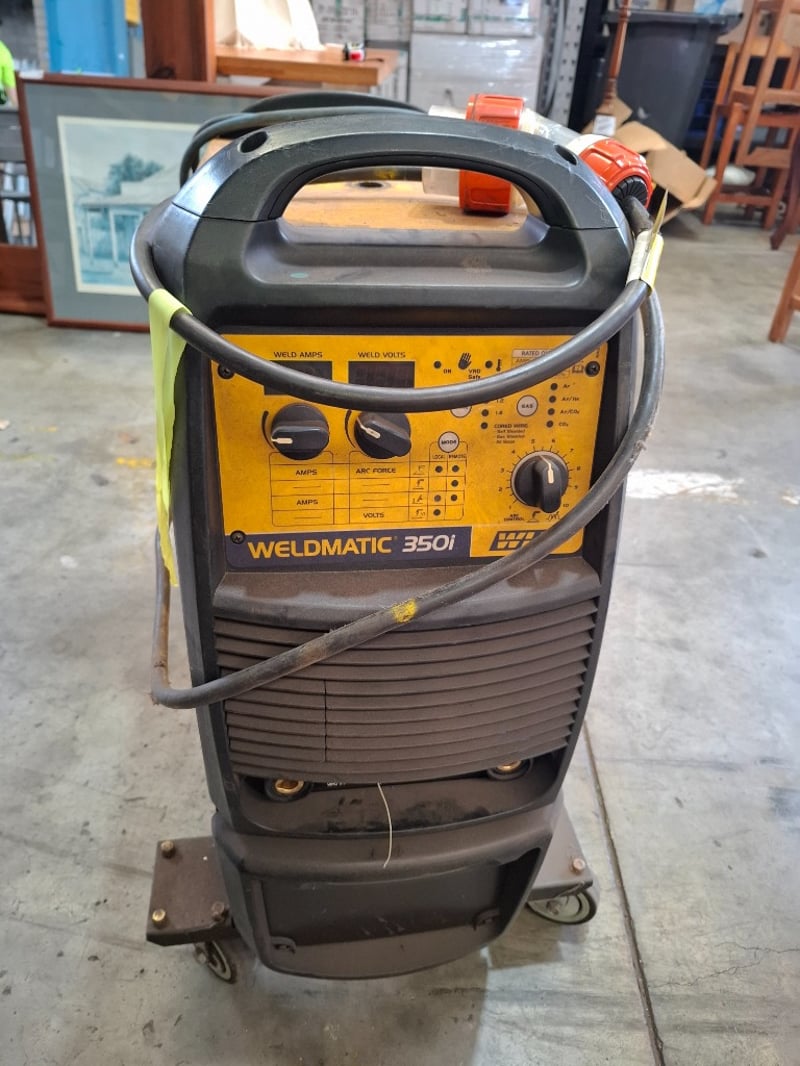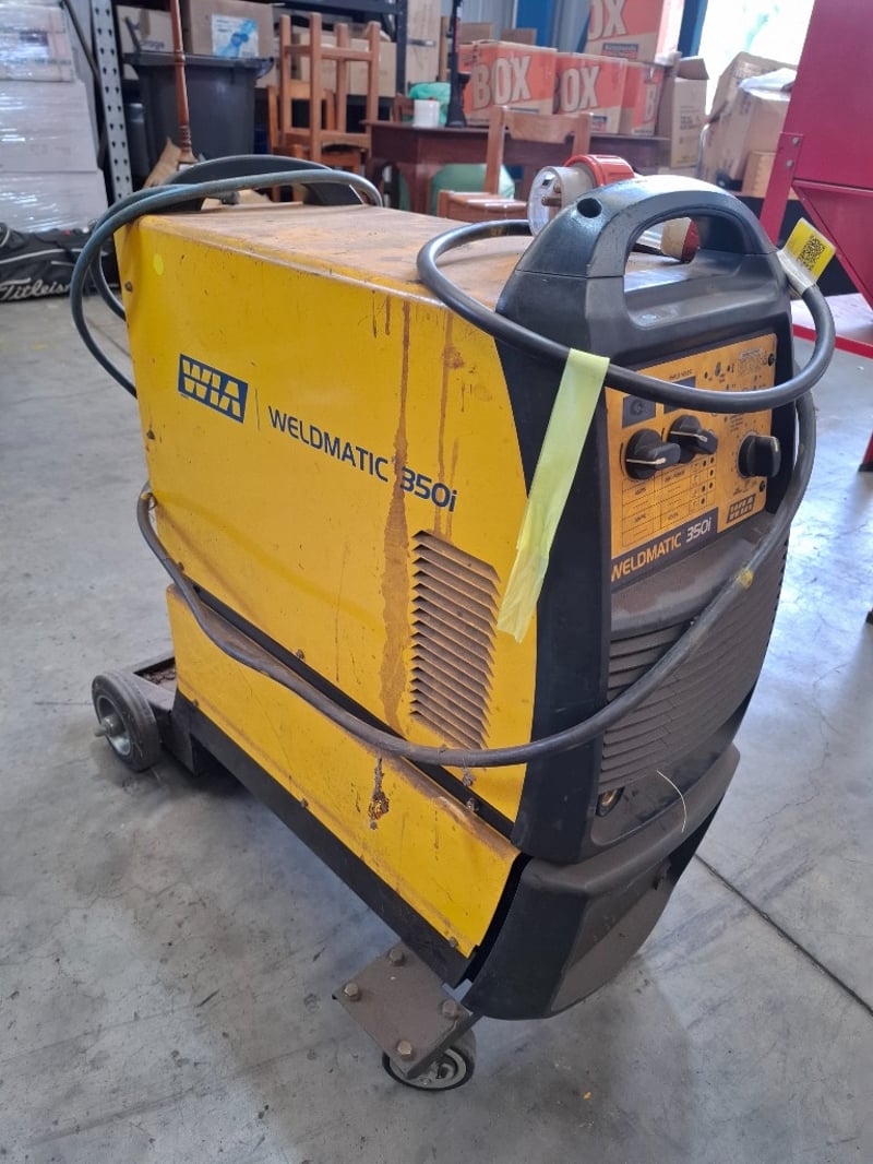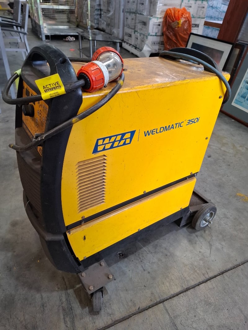 MIG welder Model: Welmatic 350i Make: WIA Serial: C1392A1117060 Dimensions: 48cmW x 86cmD x 84cmH Description/extras: welder, a heavy-duty machine designed for industrial fabrication.