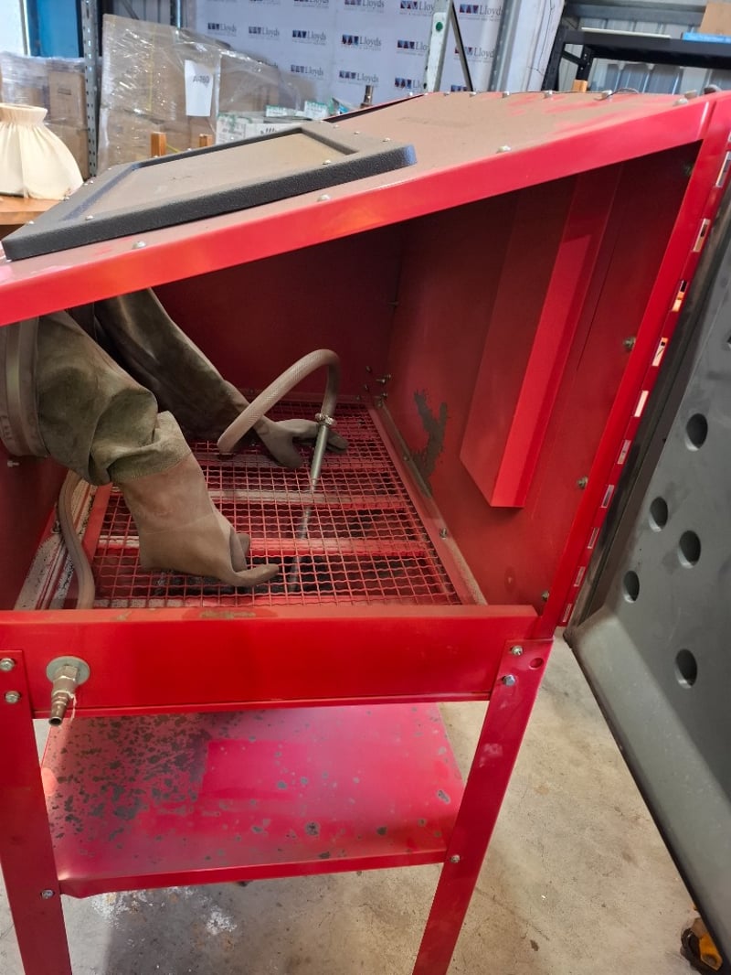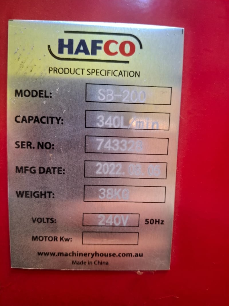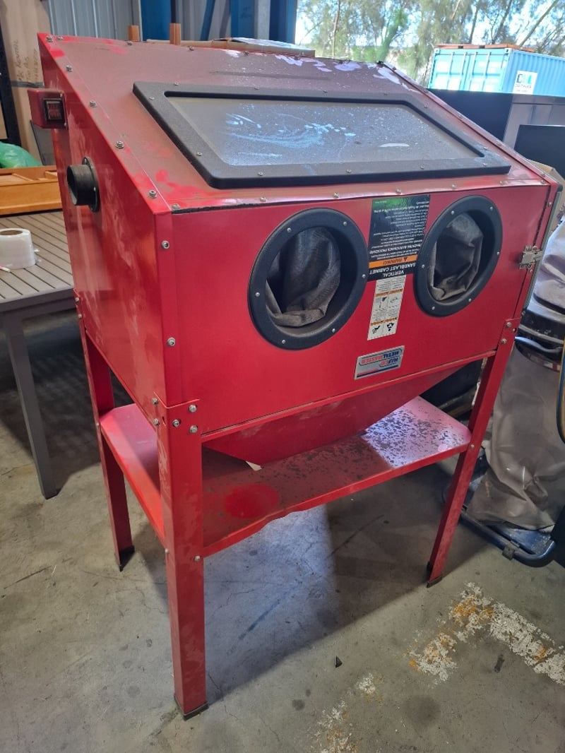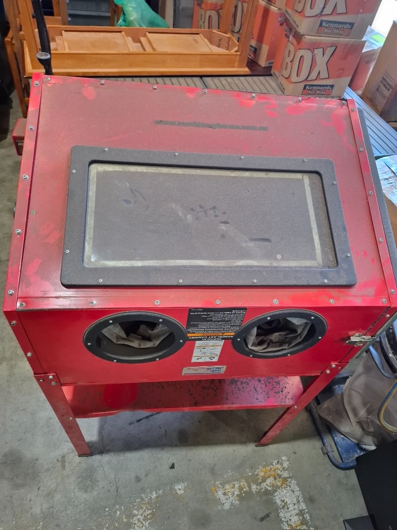 Sandblast cabinet. Model: SB-200 Make: HAFCO Serial: 743328 Dimensions: 94cmW x 57cmD x 139cmH Description/extras: capacity 340L/min, cleaning required,dents