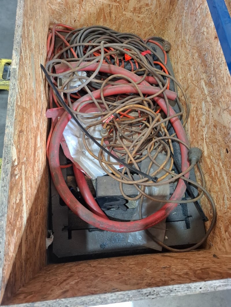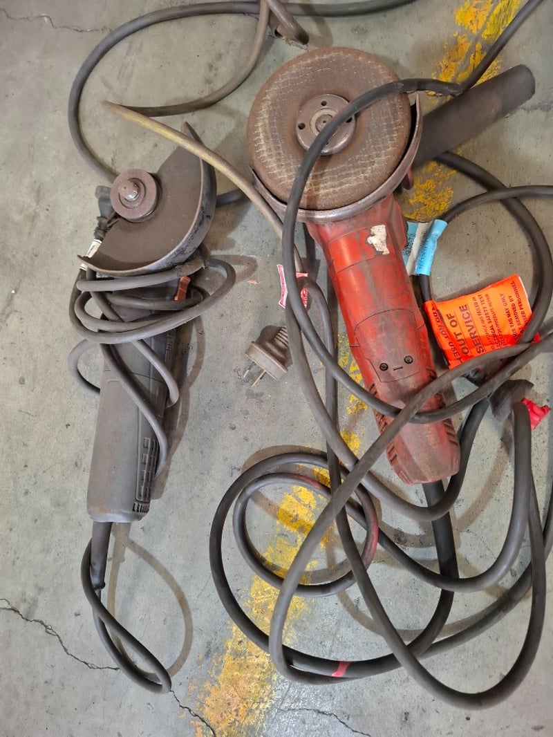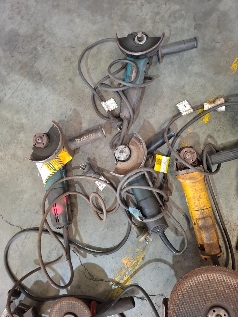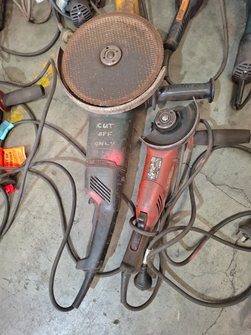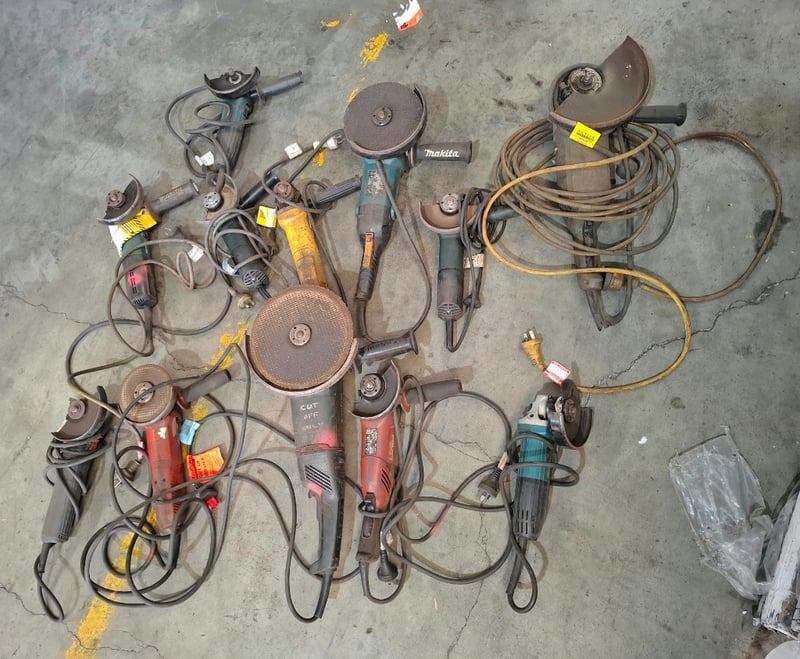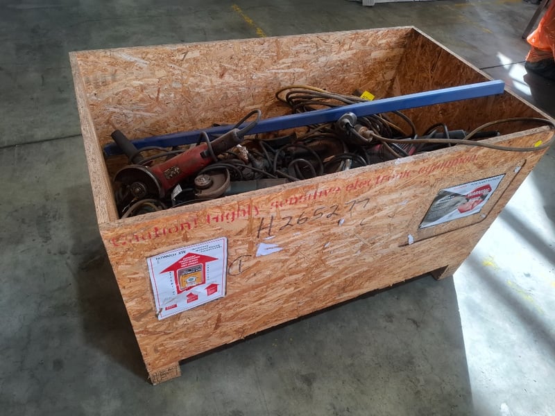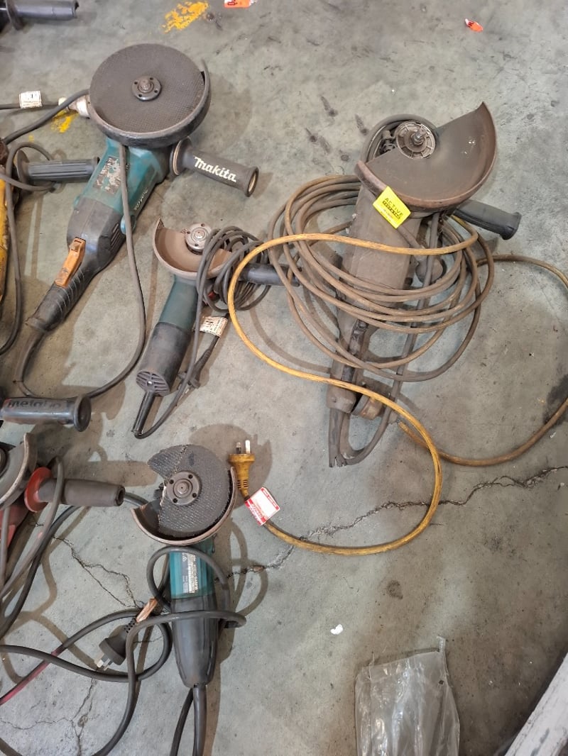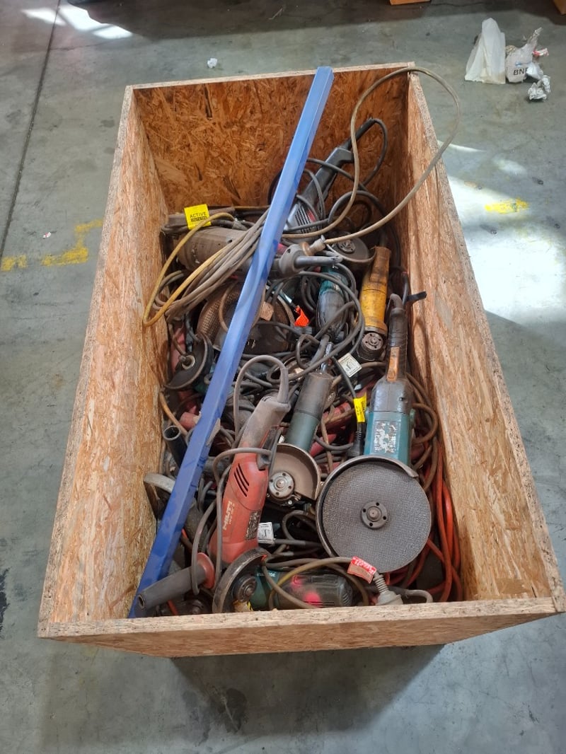 Asortment timber crate of cord angle grinders, models vary, includes power cords, Dimensions: 105cmW x 60cmDx 64 cmH Qty: to photo Sold as lot Note: Working condition unknown, hardly used, inspections recommended