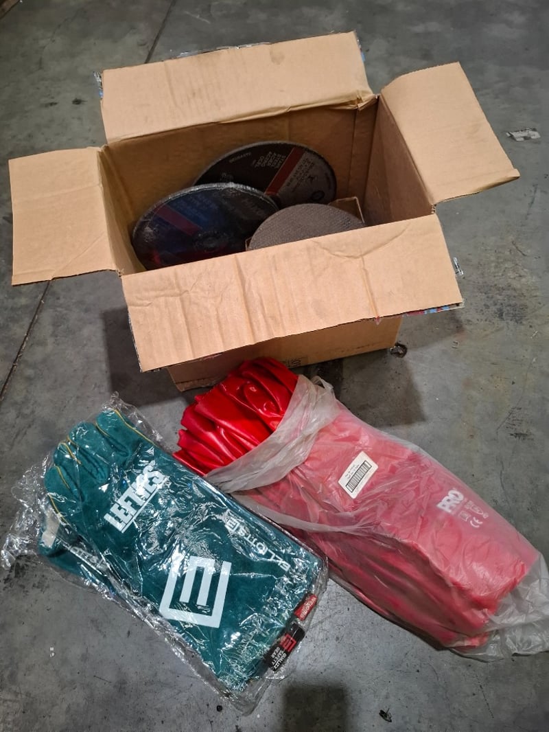 Assortment lot includes grinder discs diferent sizes, welding gloves models vary, and more Sold as lot