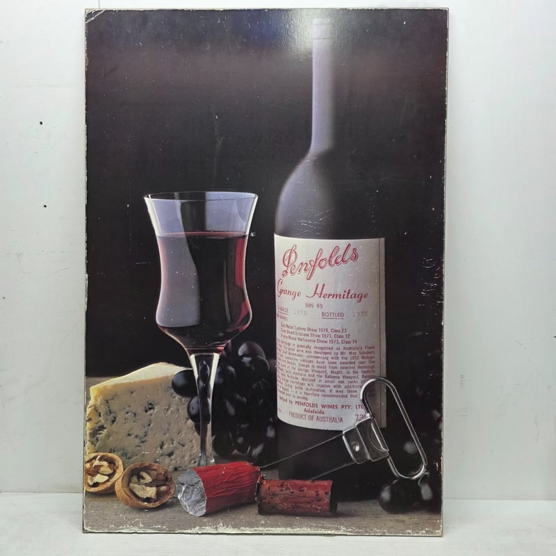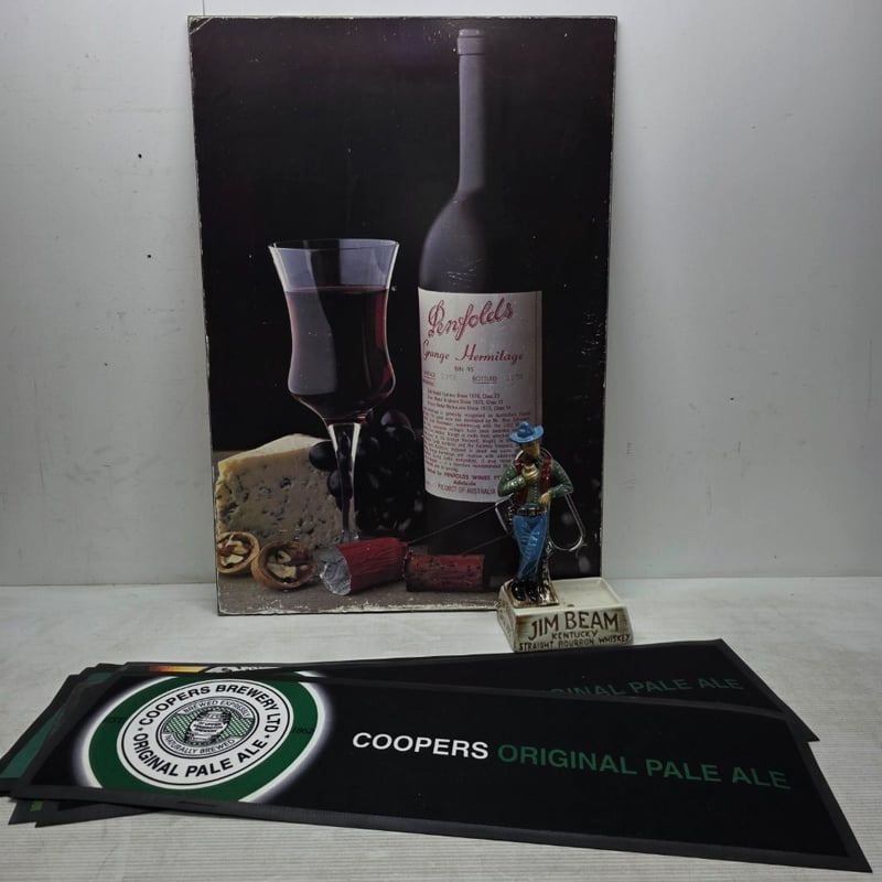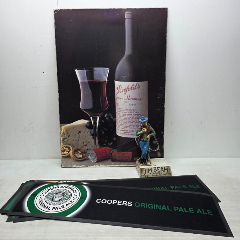 Homewares, Penfolds print, Jim Beam straight bourbon whiskey bottle and coopers original pale ale and hagn super dry beer mats Approx dimensions of print 95.5cm H x 62cm W x 2cm DSold as lot