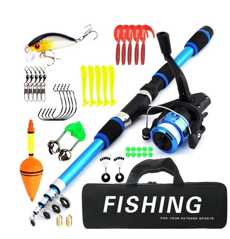 Fishing Rod and Reel Combo With Line 1.8m Telescopic Rod with Bag Hook/Lure Set Nylon Zipper Bag 38 Piece Lure Accessories kit (BRAND NEW IN BAG) BLUE