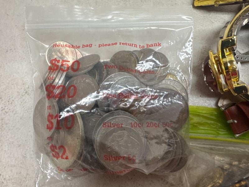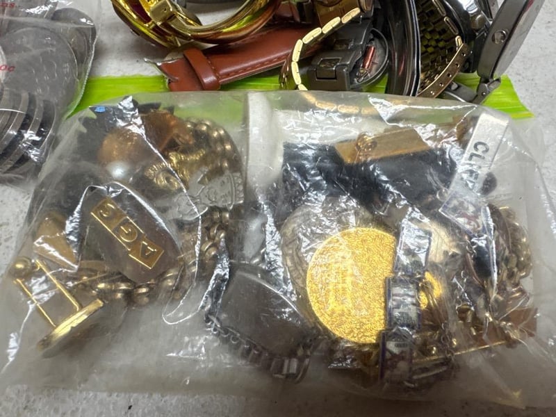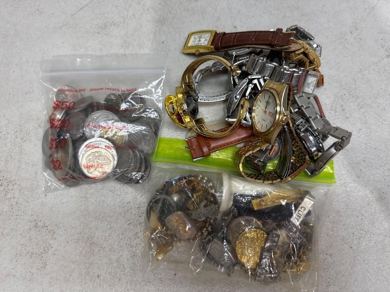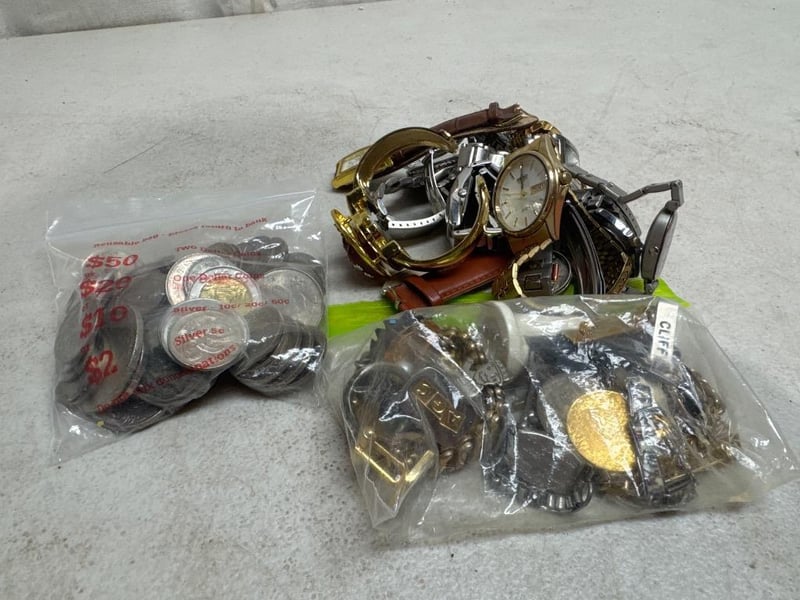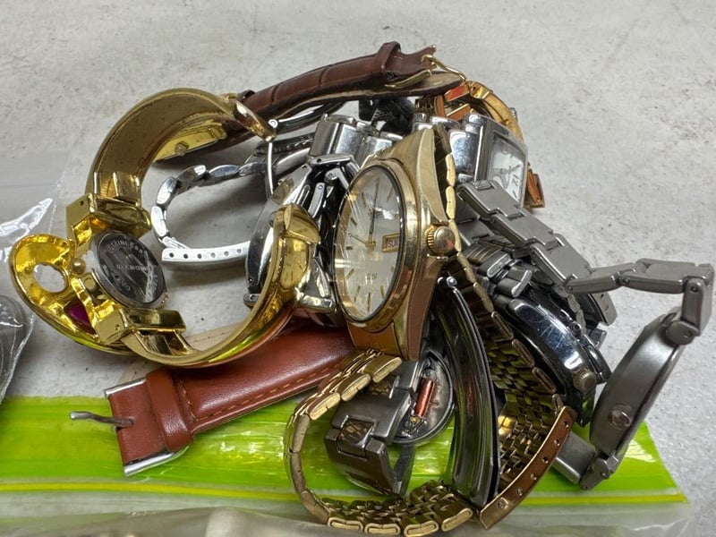 13x variety of watches, man and women's watches, includes SEIKO, PULSAR, 1x bag full of special coins, silver coloured, 1x bag variety of pins and jewellery