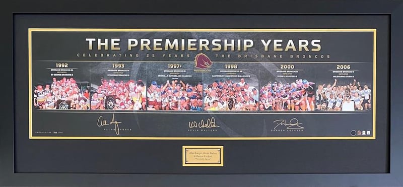 THE PREMIERSHIP YEARS, CELEBRATING 25 YEARS OF THE BRISBANE BRONCOS, LICENSED LIMITED EDITION PRINT, HAND SIGNED BY ALLAN LANGER, KEVIN WALTERS & DARREN LOCKYER