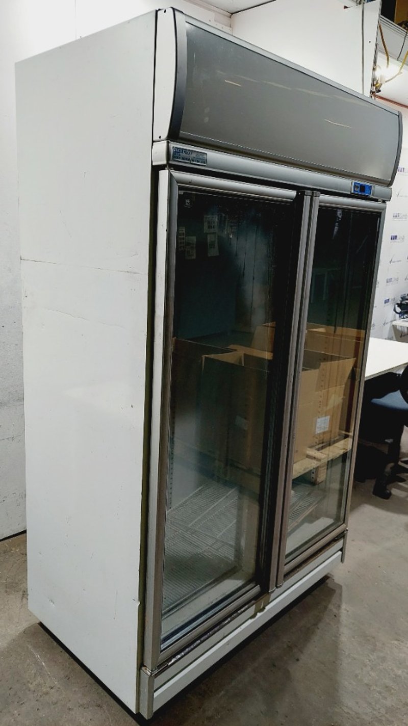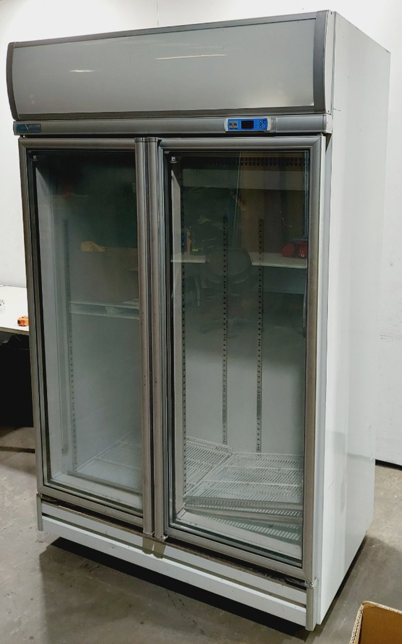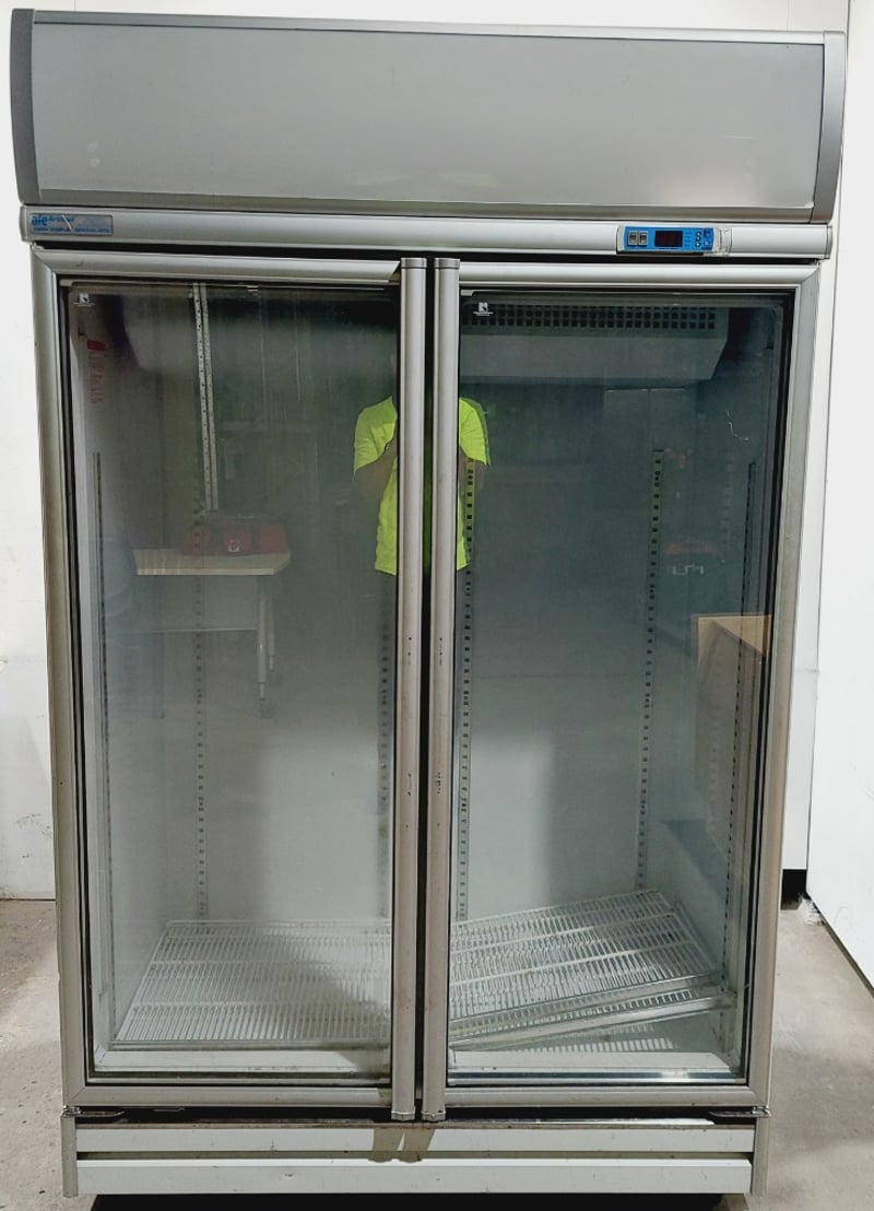 AFE Artisan Food Equipment commercial glass door chiller, Model RS-S2003T (M1102). Double door refrigerator with 896-liter capacity, featuring transparent glass doors for product visibility. Stainless steel frame .