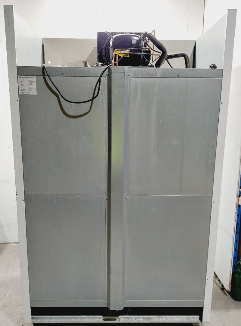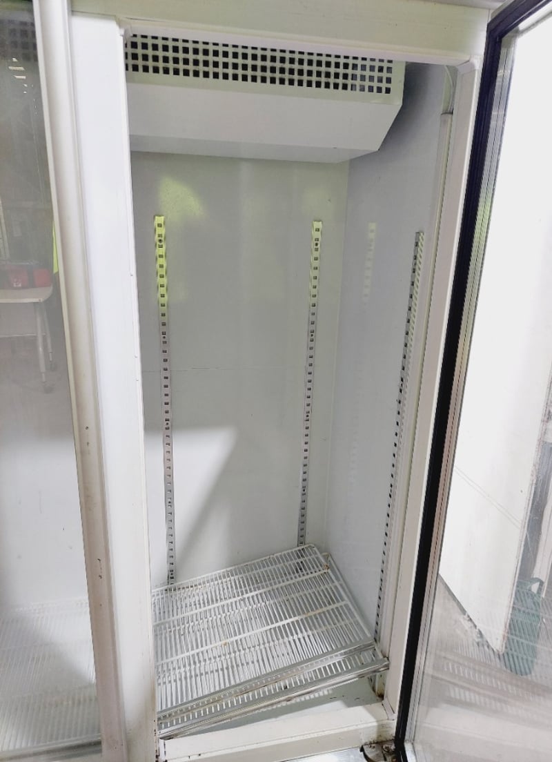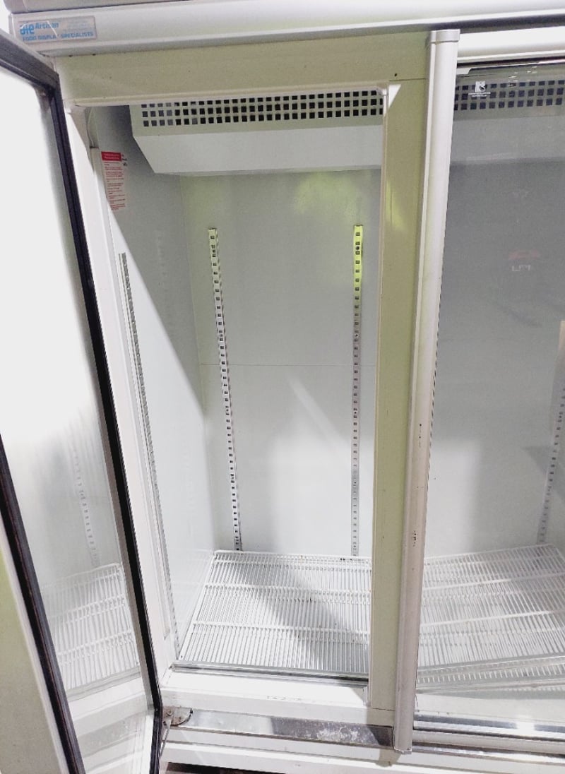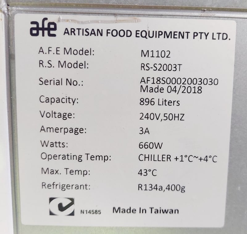 AFE Artisan Food Equipment commercial glass door chiller, Model RS-S2003T (M1102). Double door refrigerator with 896-liter capacity, featuring transparent glass doors for product visibility. Stainless steel frame .