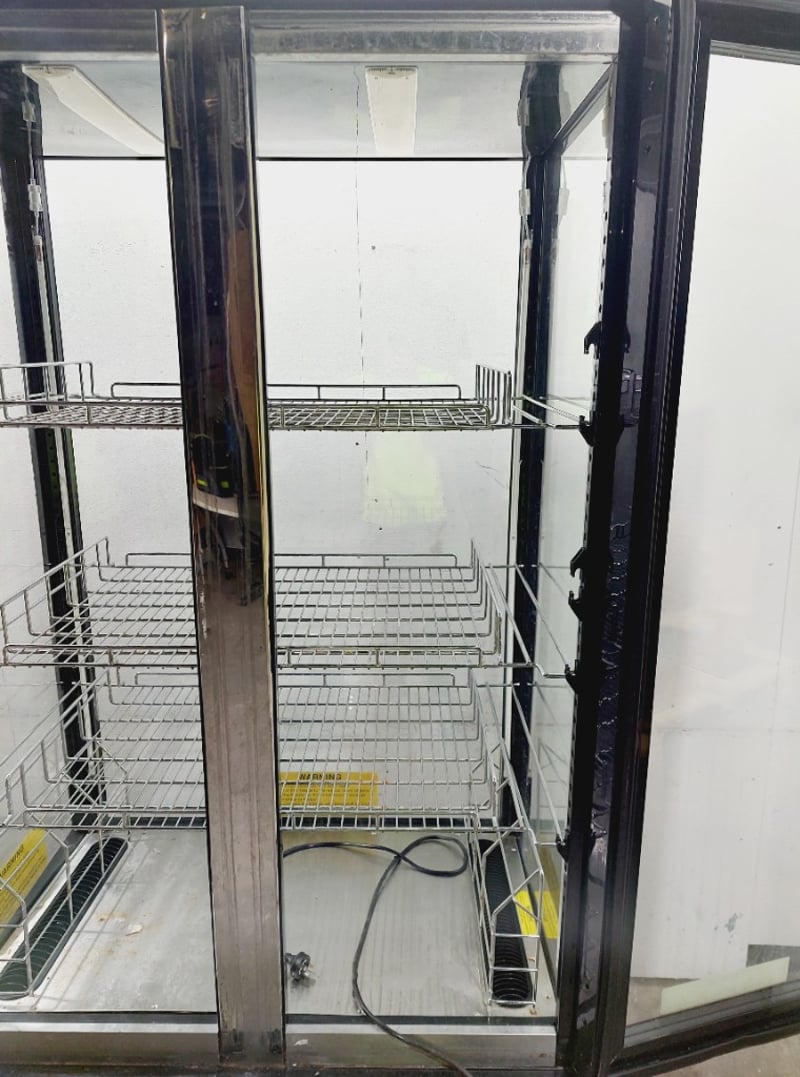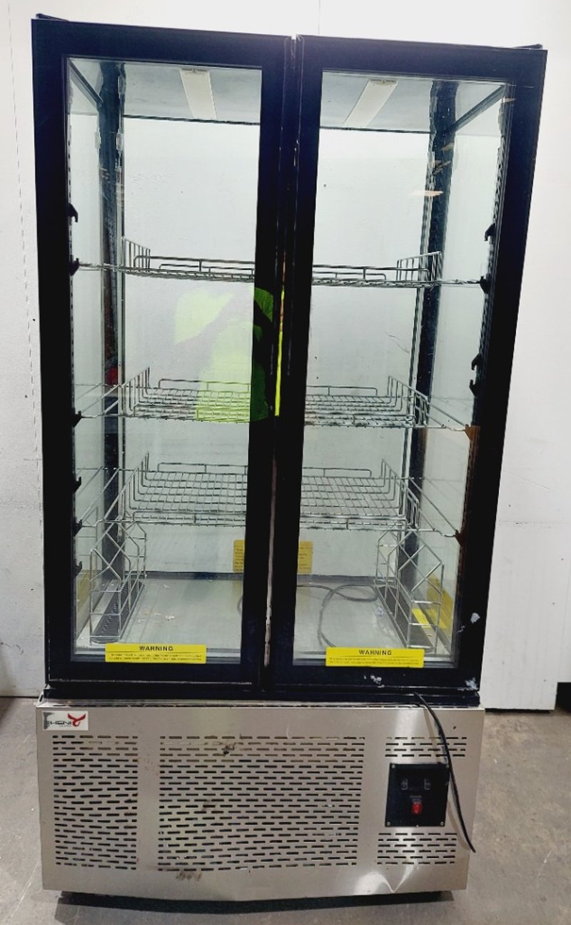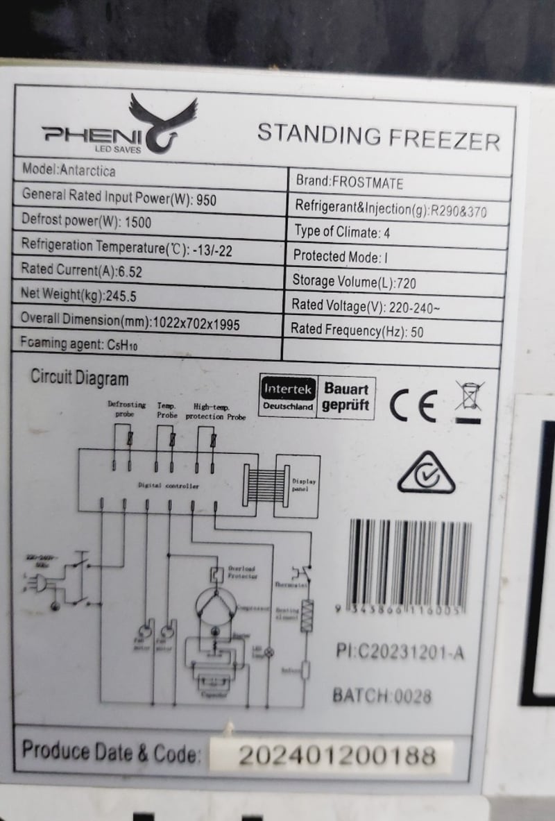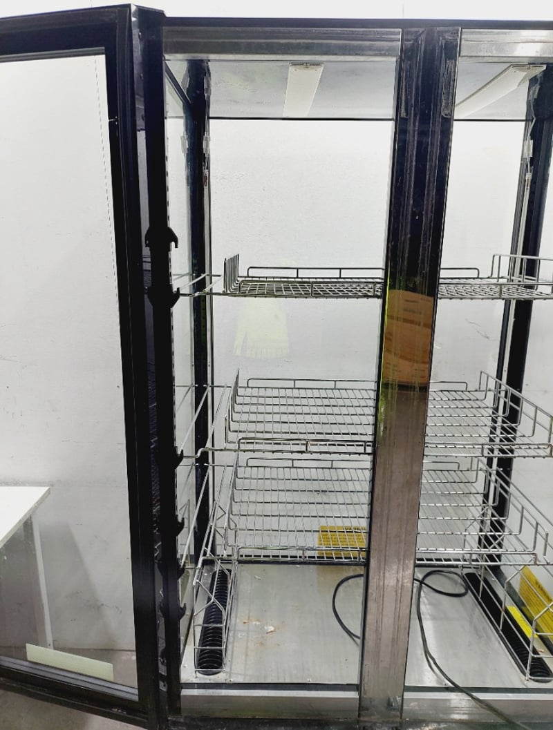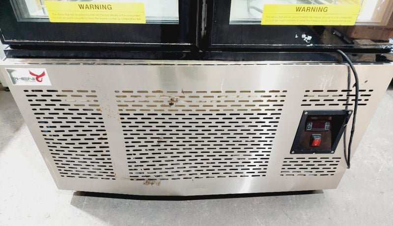 Commercial refrigerated display cabinet featuring dual glass doors with black aluminum frames. Pheni brand model "Antarctica" standing freezer by Frostmate.