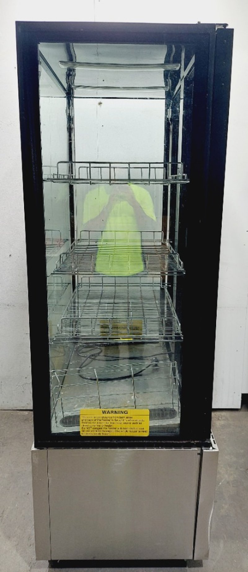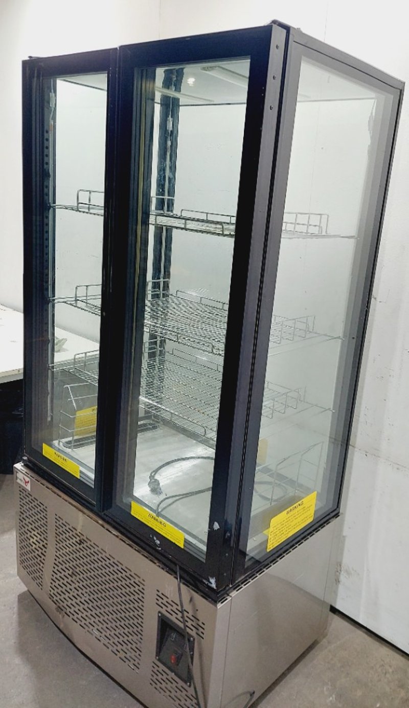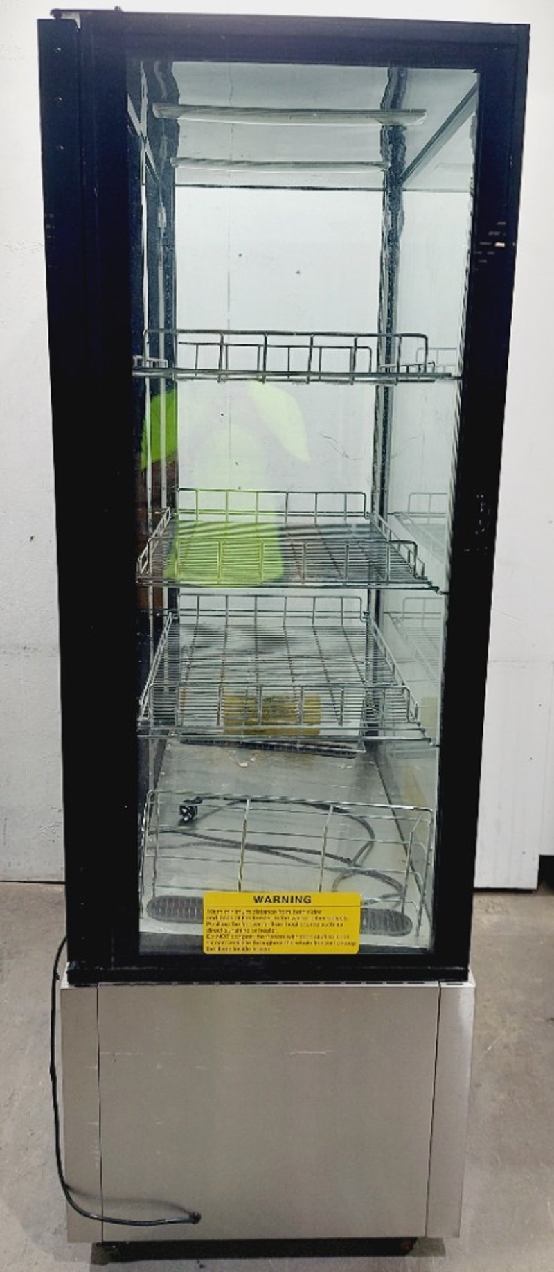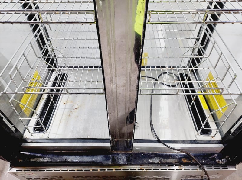 Commercial refrigerated display cabinet featuring dual glass doors with black aluminum frames. Pheni brand model "Antarctica" standing freezer by Frostmate.