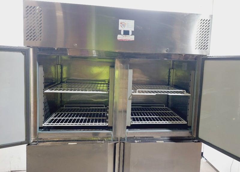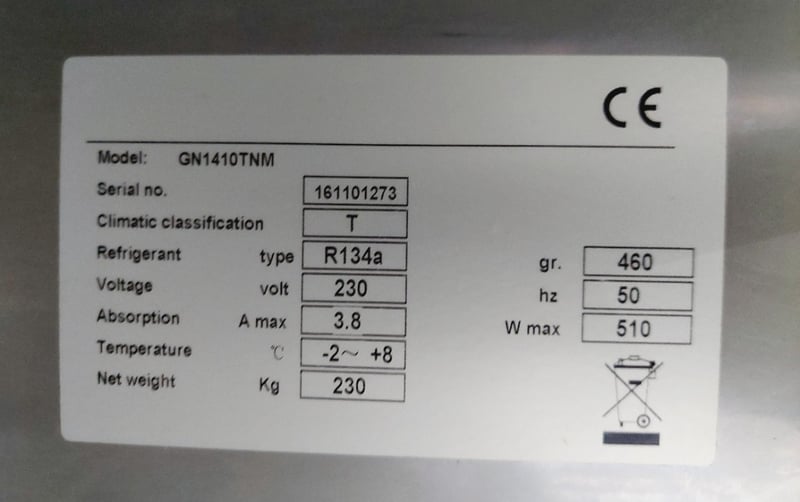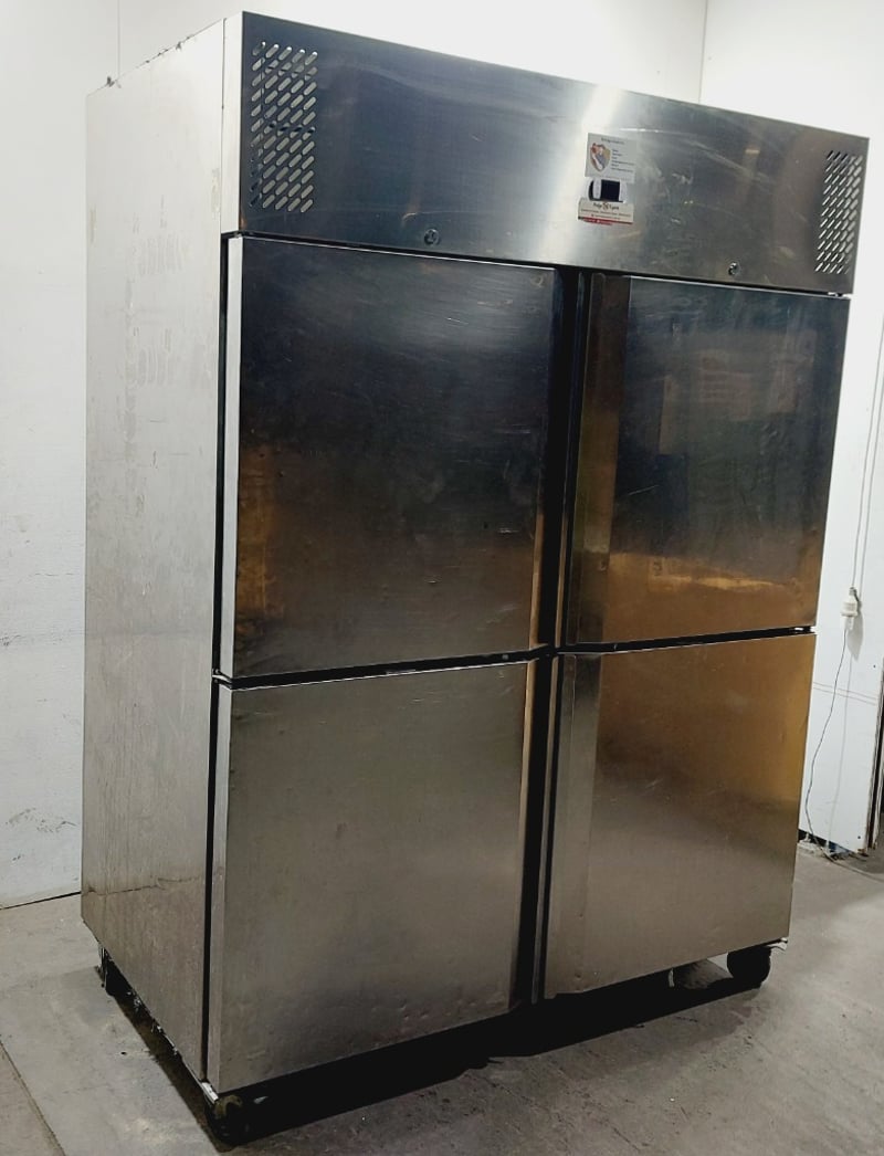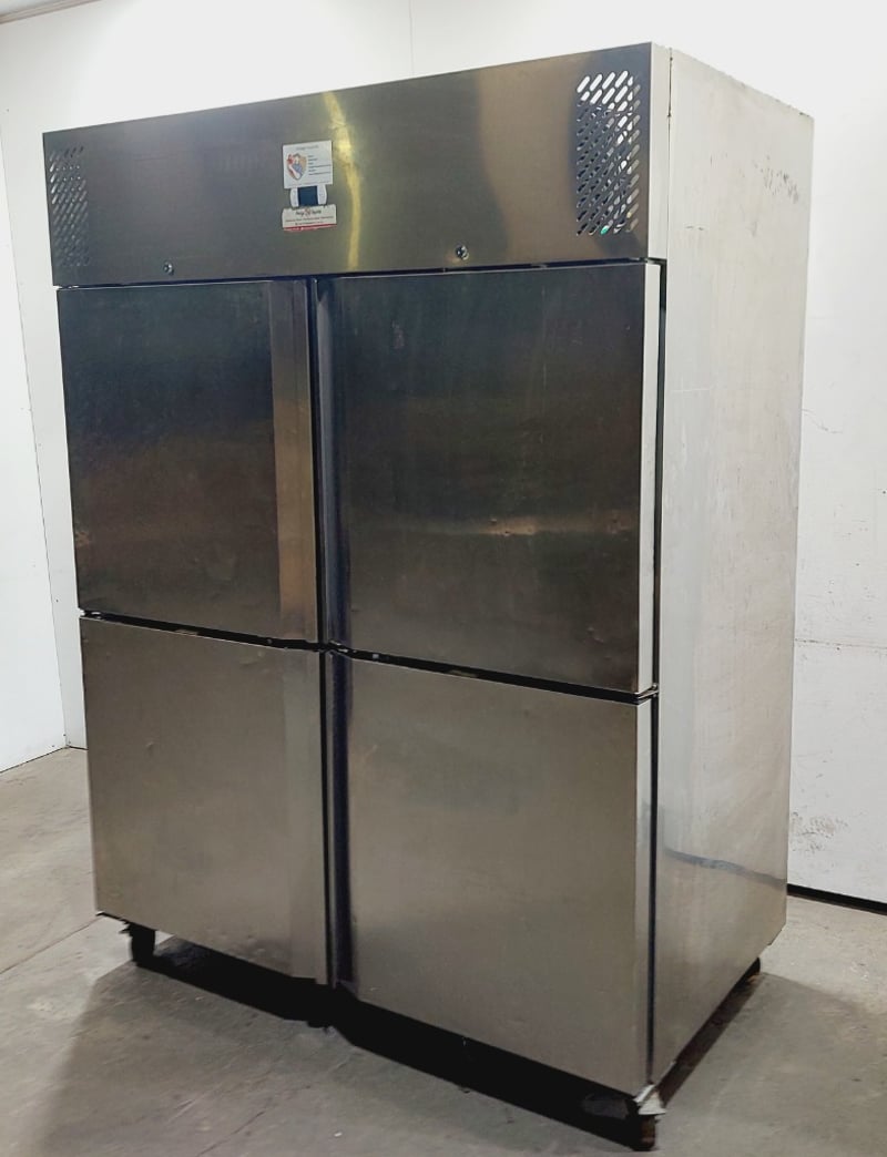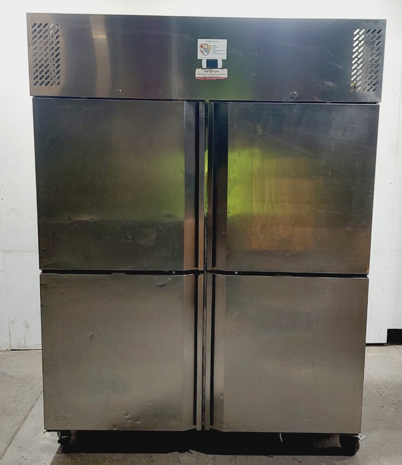 Commercial stainless steel upright freezer, Model GN1410TNM. Four-door configuration with dual temperature zones - upper two doors for freezer compartments, lower two doors for refrigerator storage. Stainless steel exterior with ventilation grilles on top unit. Wire shelving throughout interior compartments. Mounted on heavy-duty castors for mobility. Features R134a refrigerant system, 230V single-phase power supply, 50Hz operation.Dimensions: 148 x 83 x 201cmNote: untested,signs of wear