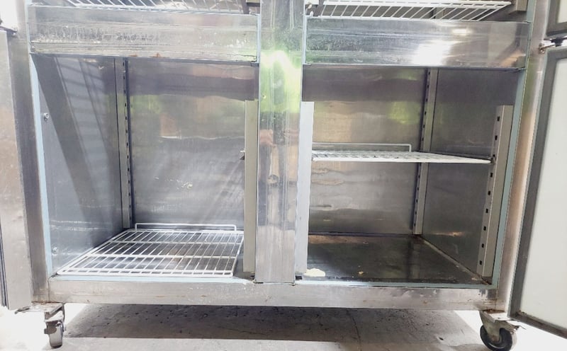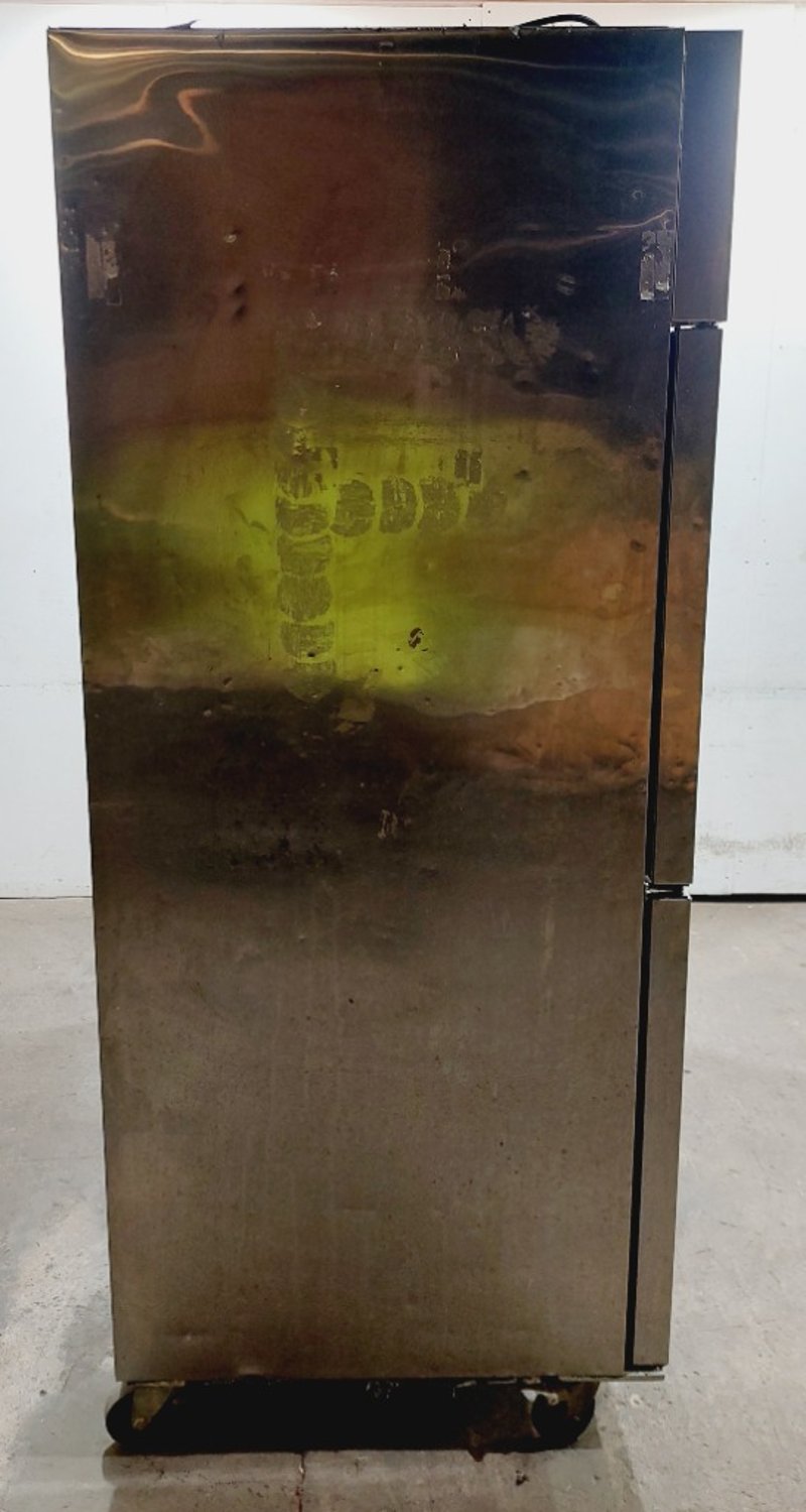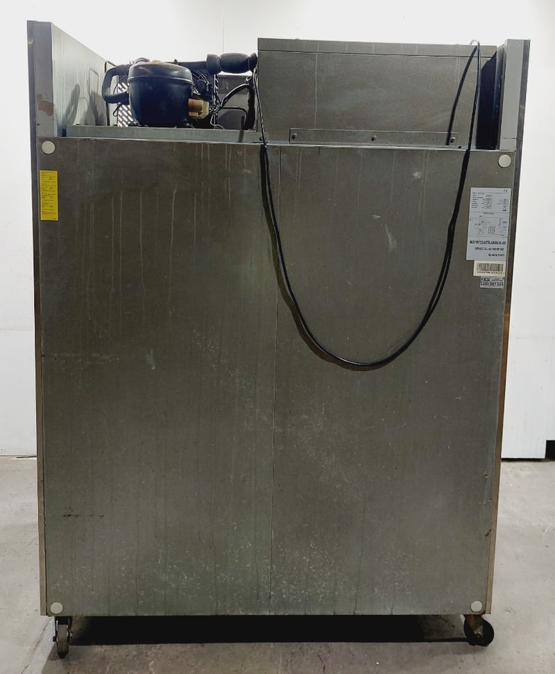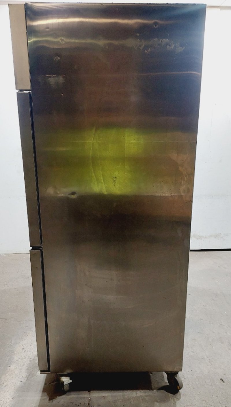 Commercial stainless steel upright freezer, Model GN1410TNM. Four-door configuration with dual temperature zones - upper two doors for freezer compartments, lower two doors for refrigerator storage. Stainless steel exterior with ventilation grilles on top unit. Wire shelving throughout interior compartments. Mounted on heavy-duty castors for mobility. Features R134a refrigerant system, 230V single-phase power supply, 50Hz operation.Dimensions: 148 x 83 x 201cmNote: untested,signs of wear
