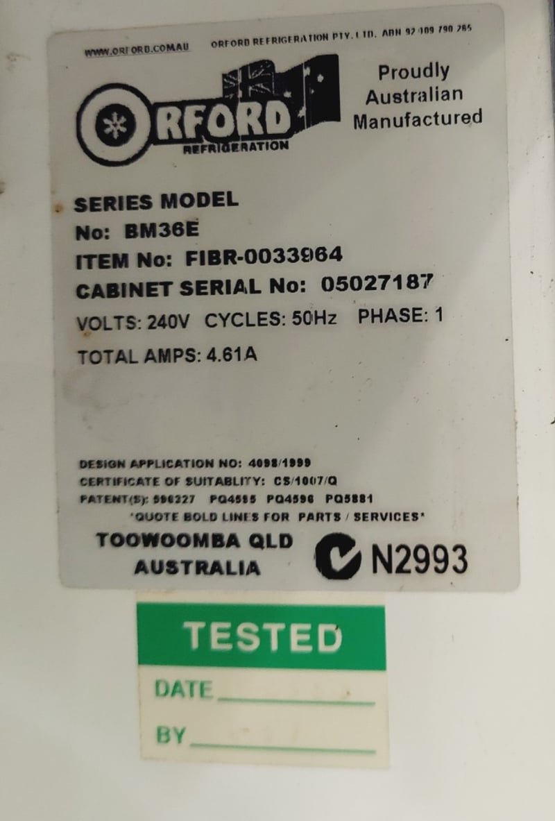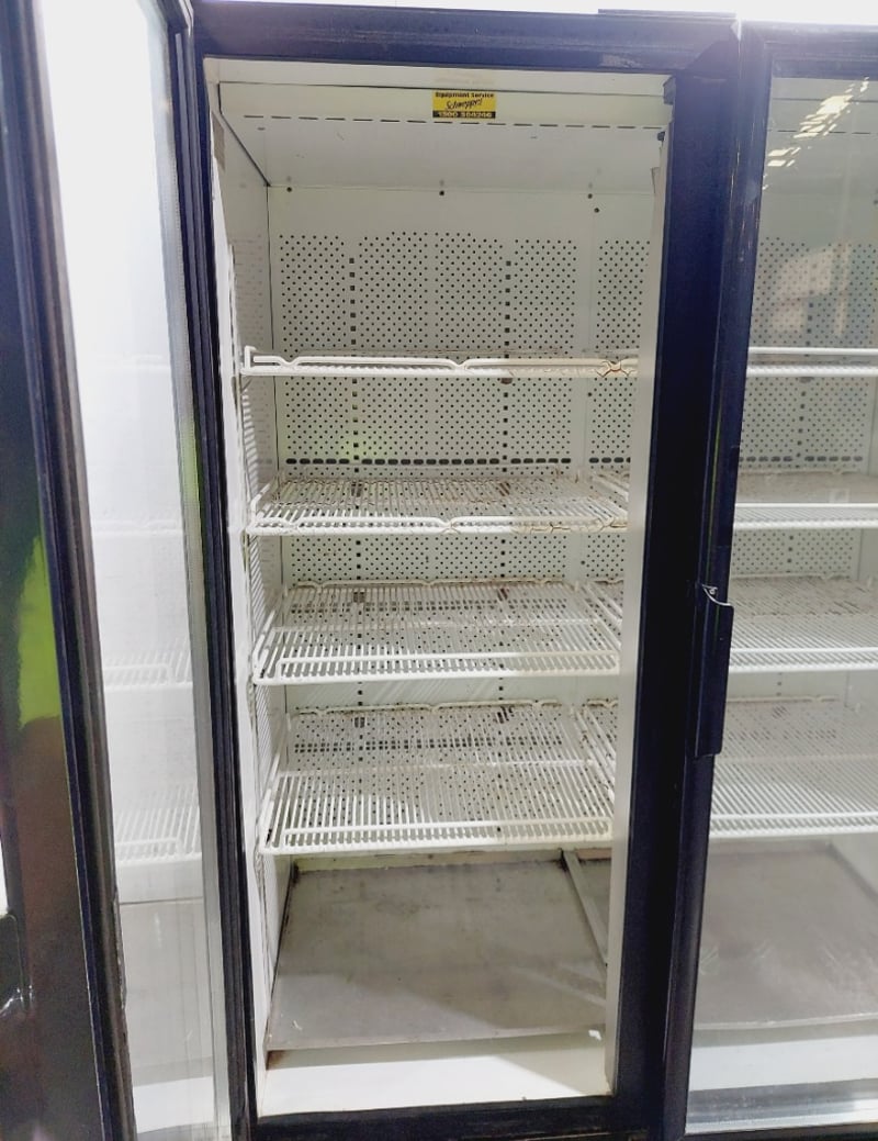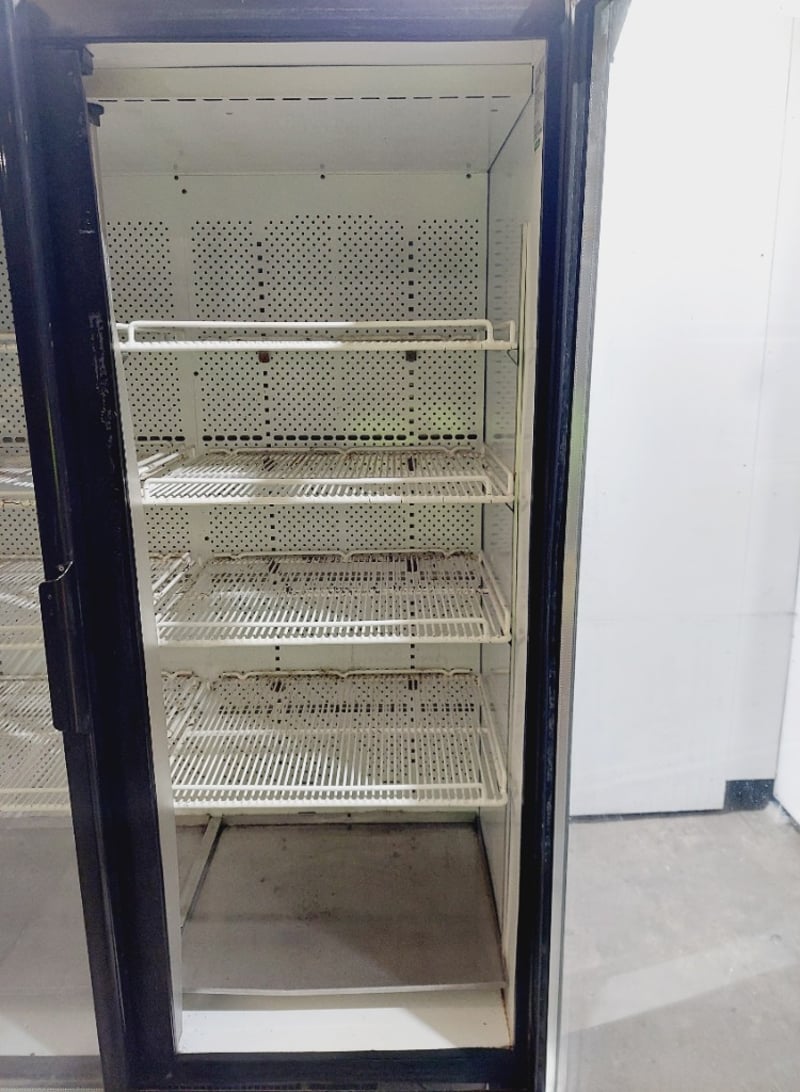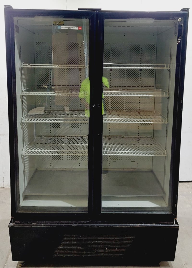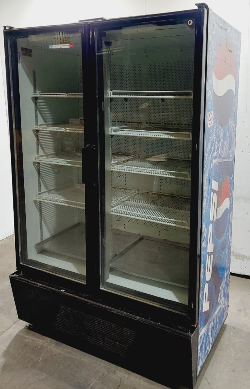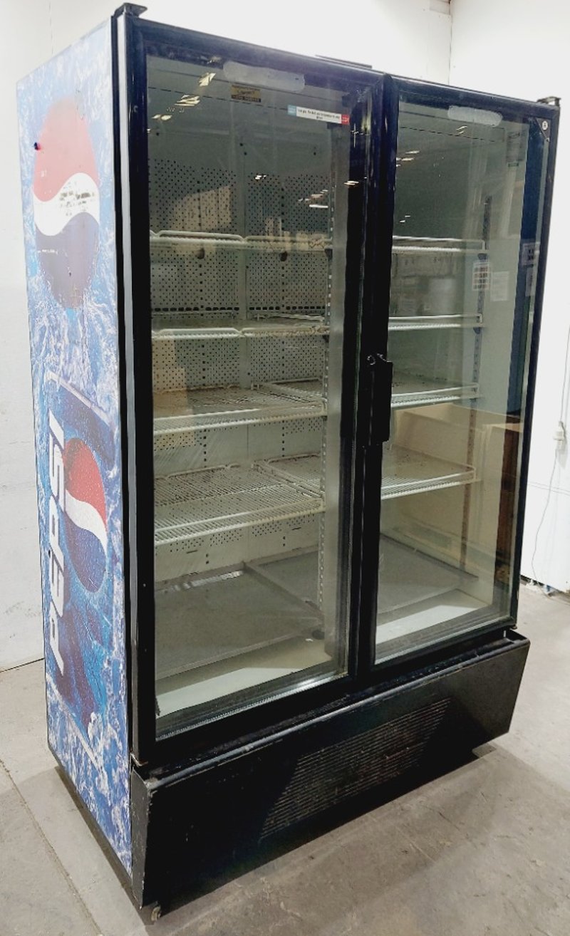 Orford Refrigeration BM36E beverage cooler display cabinet. Dual glass-door upright freezer unit featuring Pepsi branding on exterior panels.