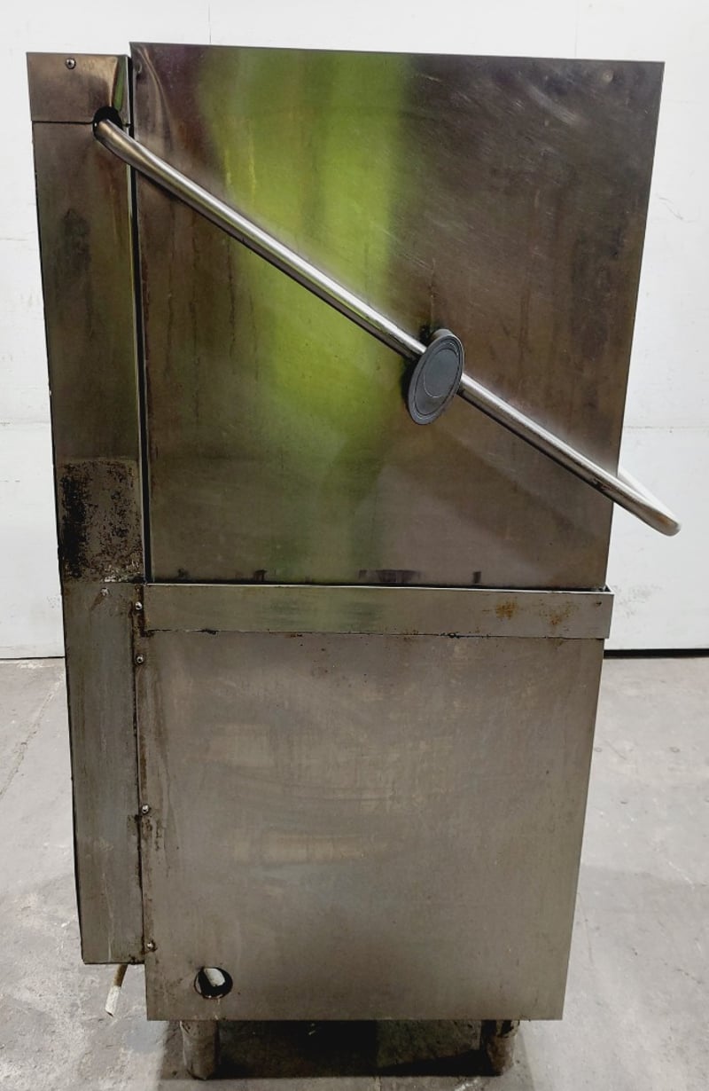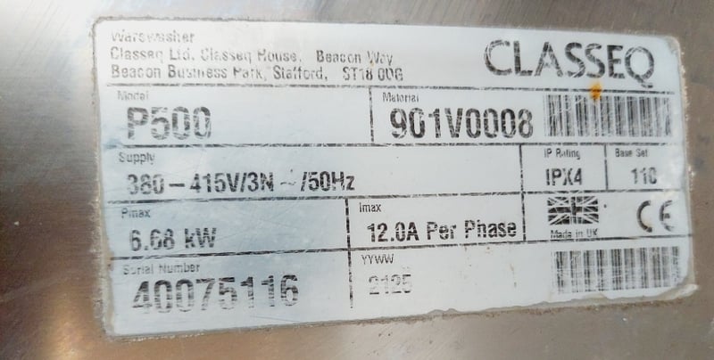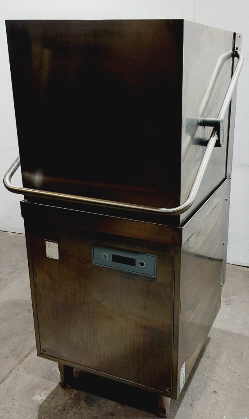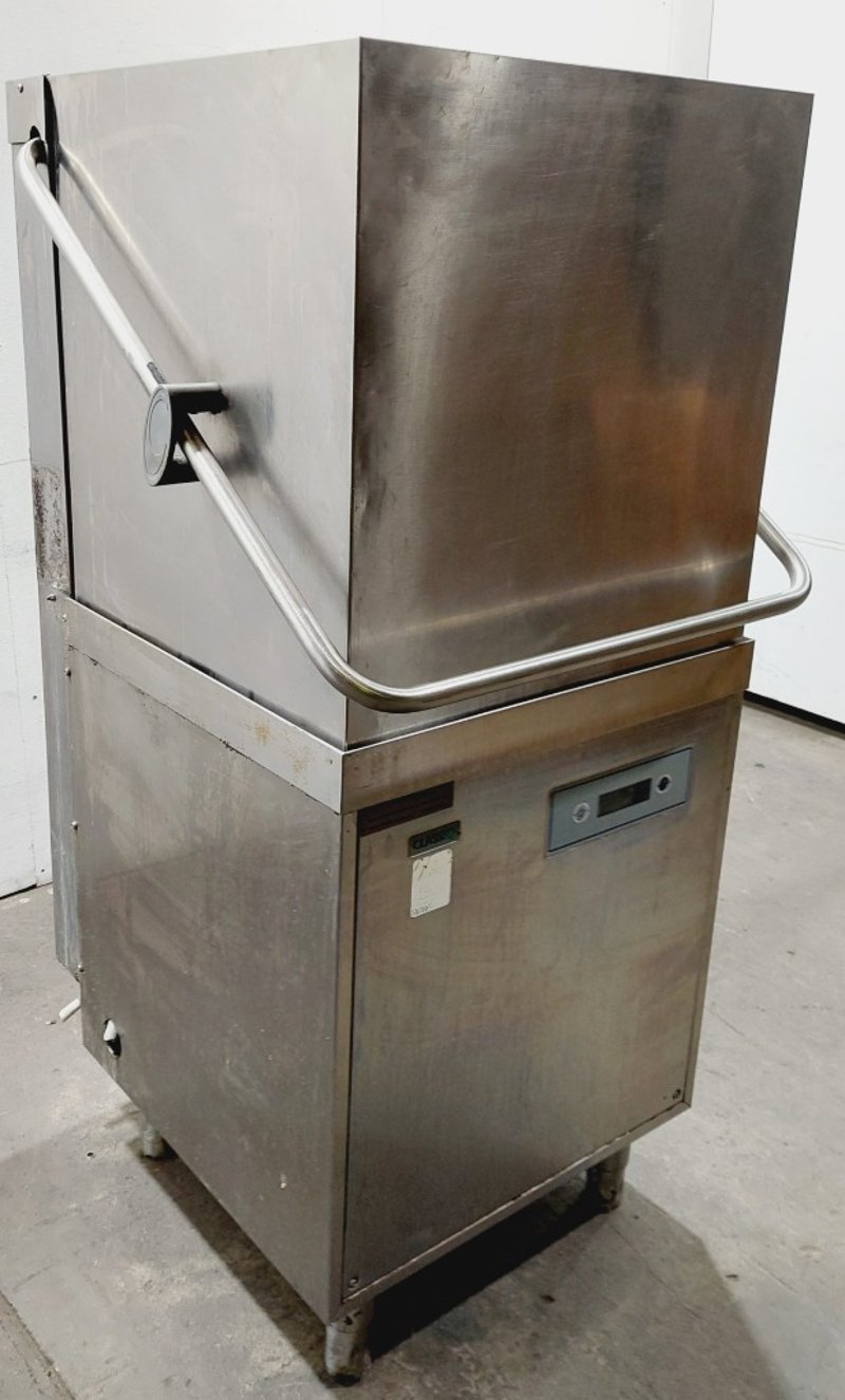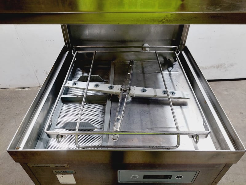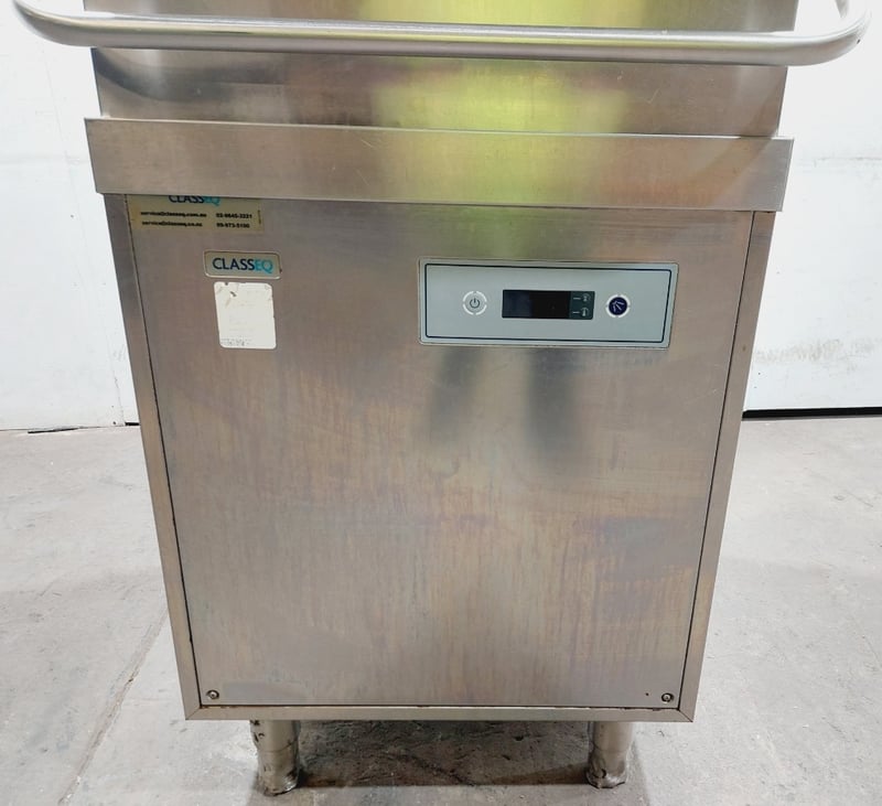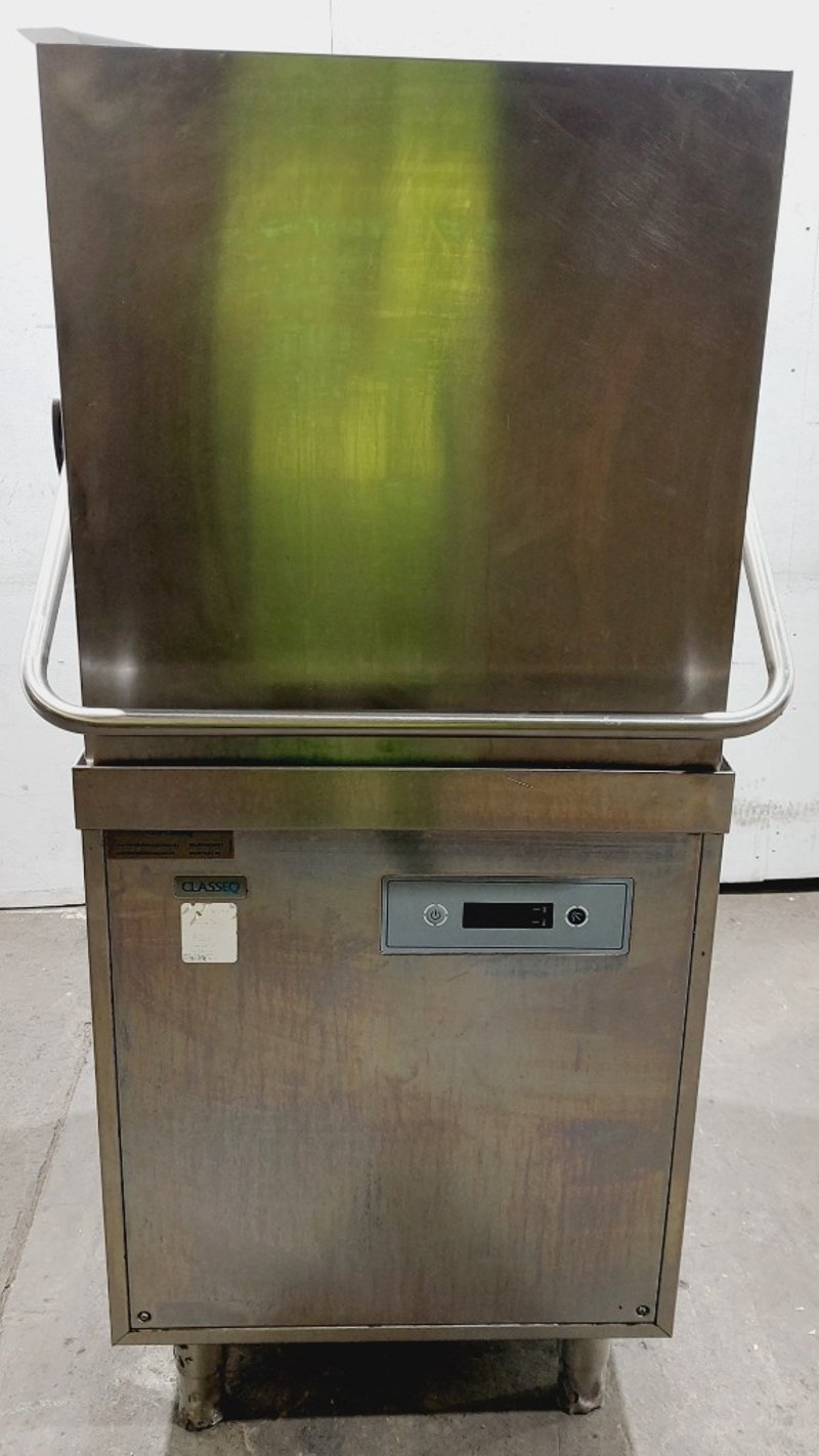 ClassEQ P2000 passthrough dishwasher, stainless steel construction with white interior door panel. Hood-type design with top-loading configuration. Features digital control panel with electronic display and push-button operation. Model P2000, Material 9011V0008.